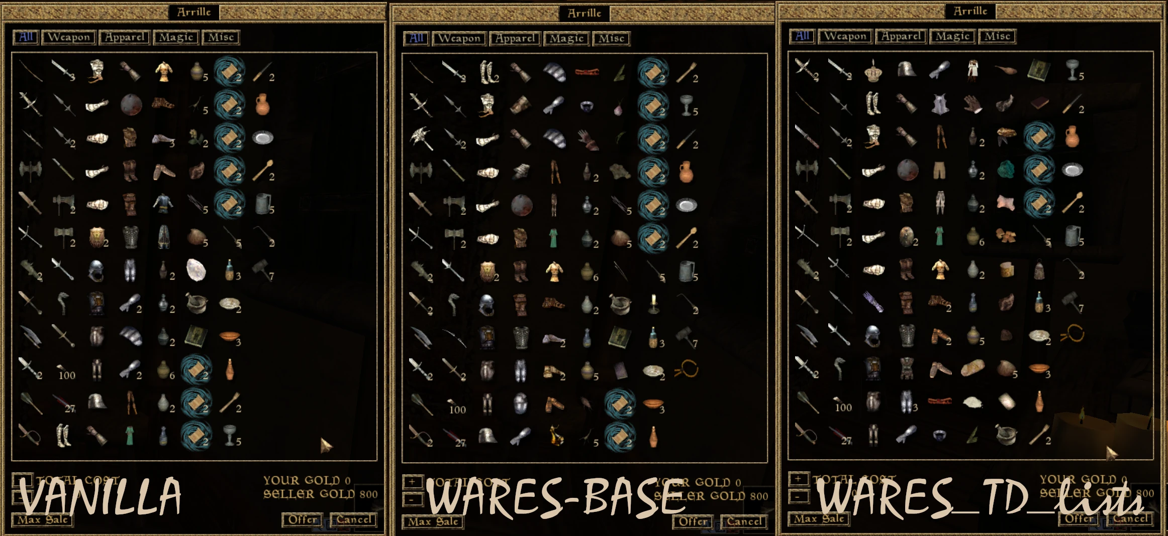 В зависимости от вашего списка модов Wares будет работать с ванильными предметами, элементами Tamriel Data или предметами из любого мода, поддерживающего Wares (если вам не нравится мод с поддержкой Wares, используйте оригинал).