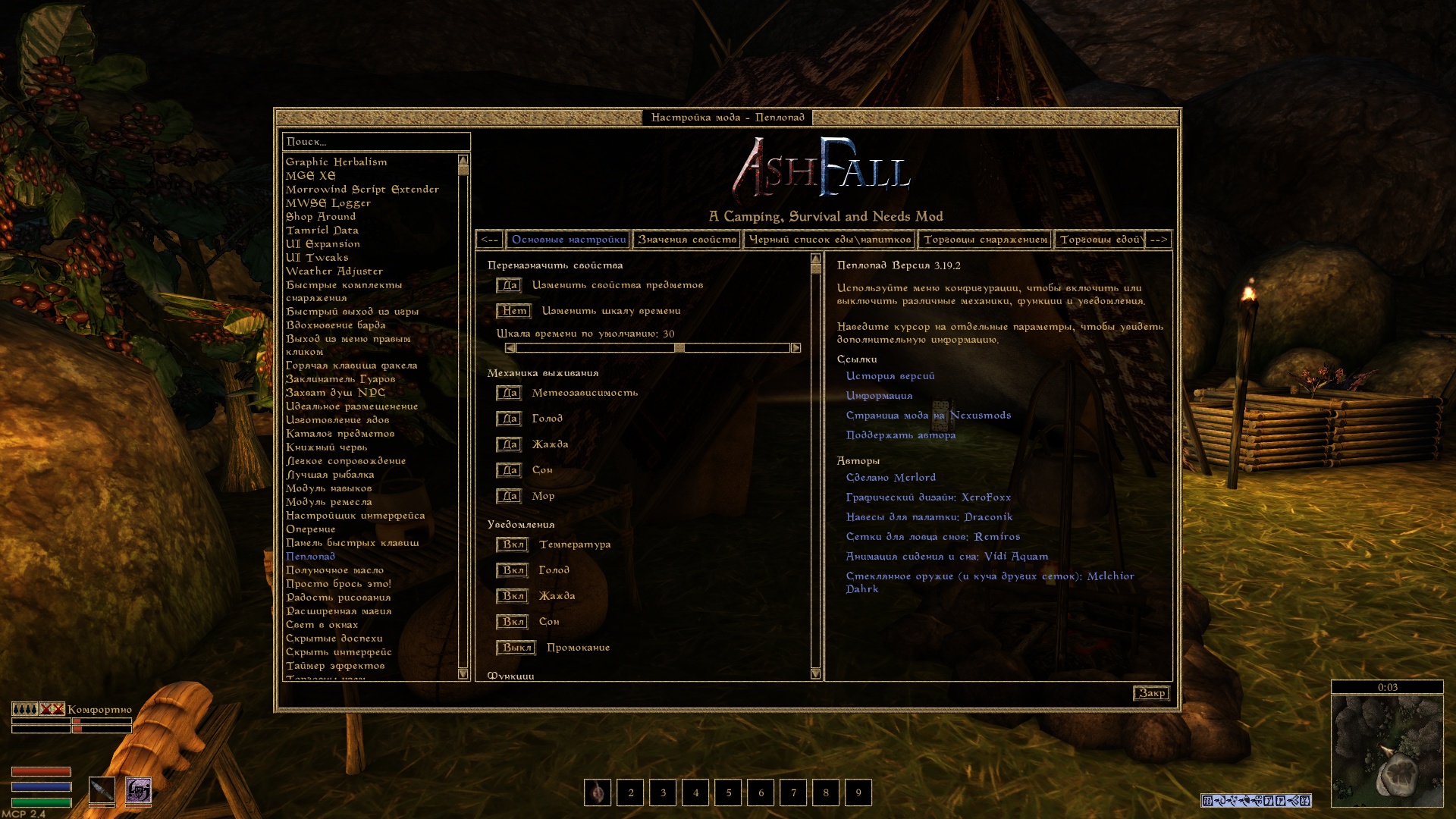 Пеплопад это мод про выживание в лагере с механикой голода, жажды, усталости, приготовления пищи, температуры и созданием предметов из подручных материалов, а также новыми визуальными эффектами: вы можете видеть иней на своем дыхании в холодную погоду, наблюдать за тем, как еда готовится на гриле в реальном времени, а походное снаряжение отображается на рюкзаке.