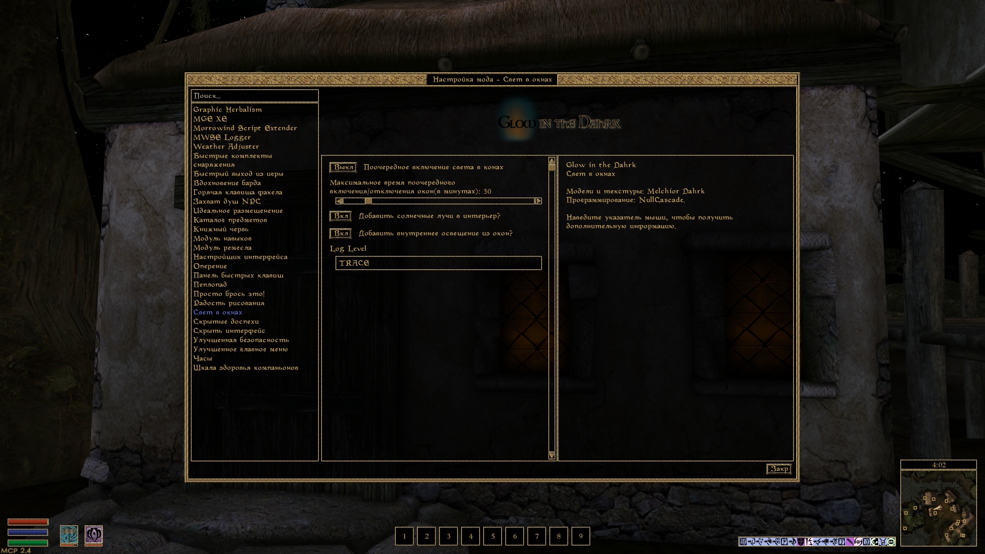 04 Raven Rock Glass Windows - С этим плагином окна в Вороньей Скале будут светиться ночью. Без него окна зданий Вороньей Скалы будут закрыты, как в базовой игре и не будут светиться. Что бы добавить окна во внутренние интерьеры Вороньей скалы необходимо подключить GITD_WL_RR_Interiors.esp. Файл отредактирован для работы на русской версии Bloodmoon.esm от 1с\Акелла, с другими версиями будет работать неправильно.)