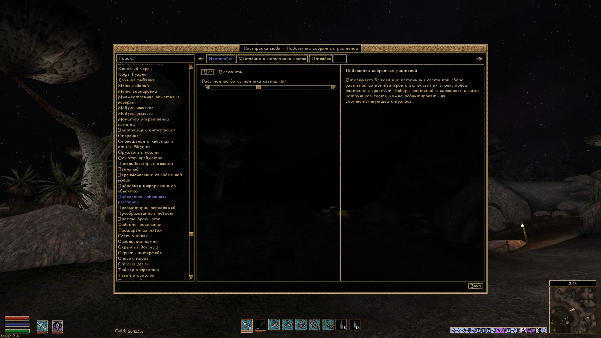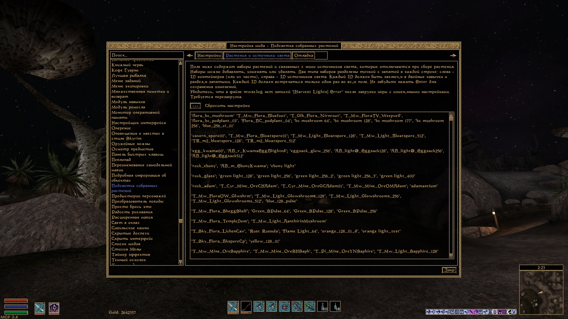 Настройки по умолчанию содержат наборы растений и источников света как из оригинальной игры, так и из Tamriel_Data. Наборы растений и источников света можно изменять в меню настройки мода.