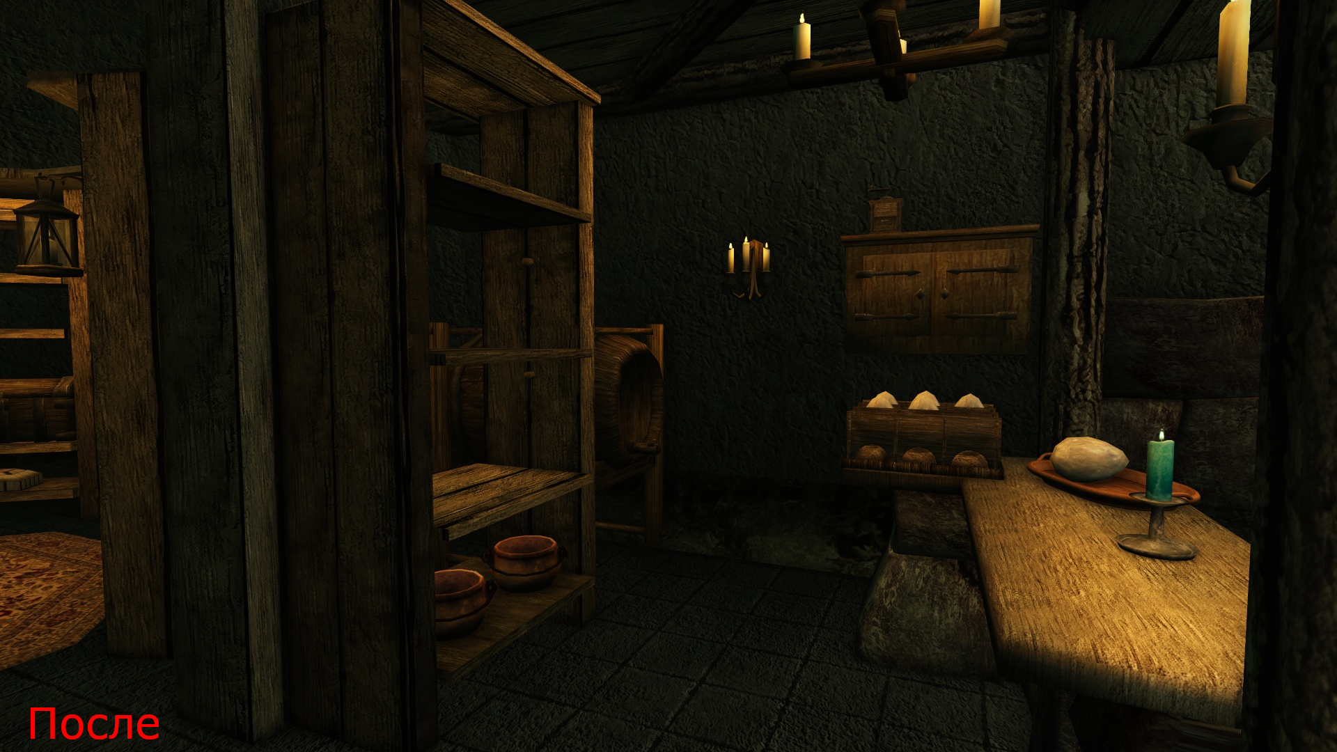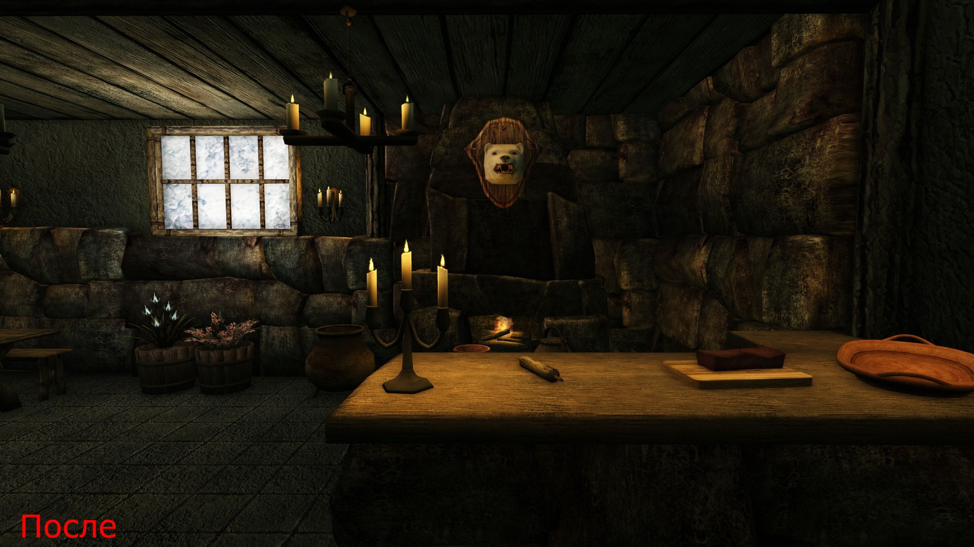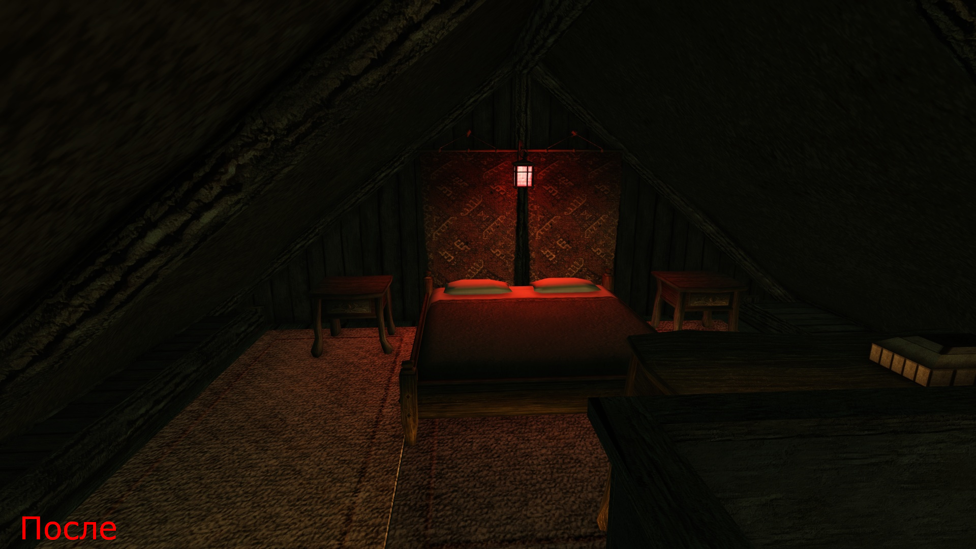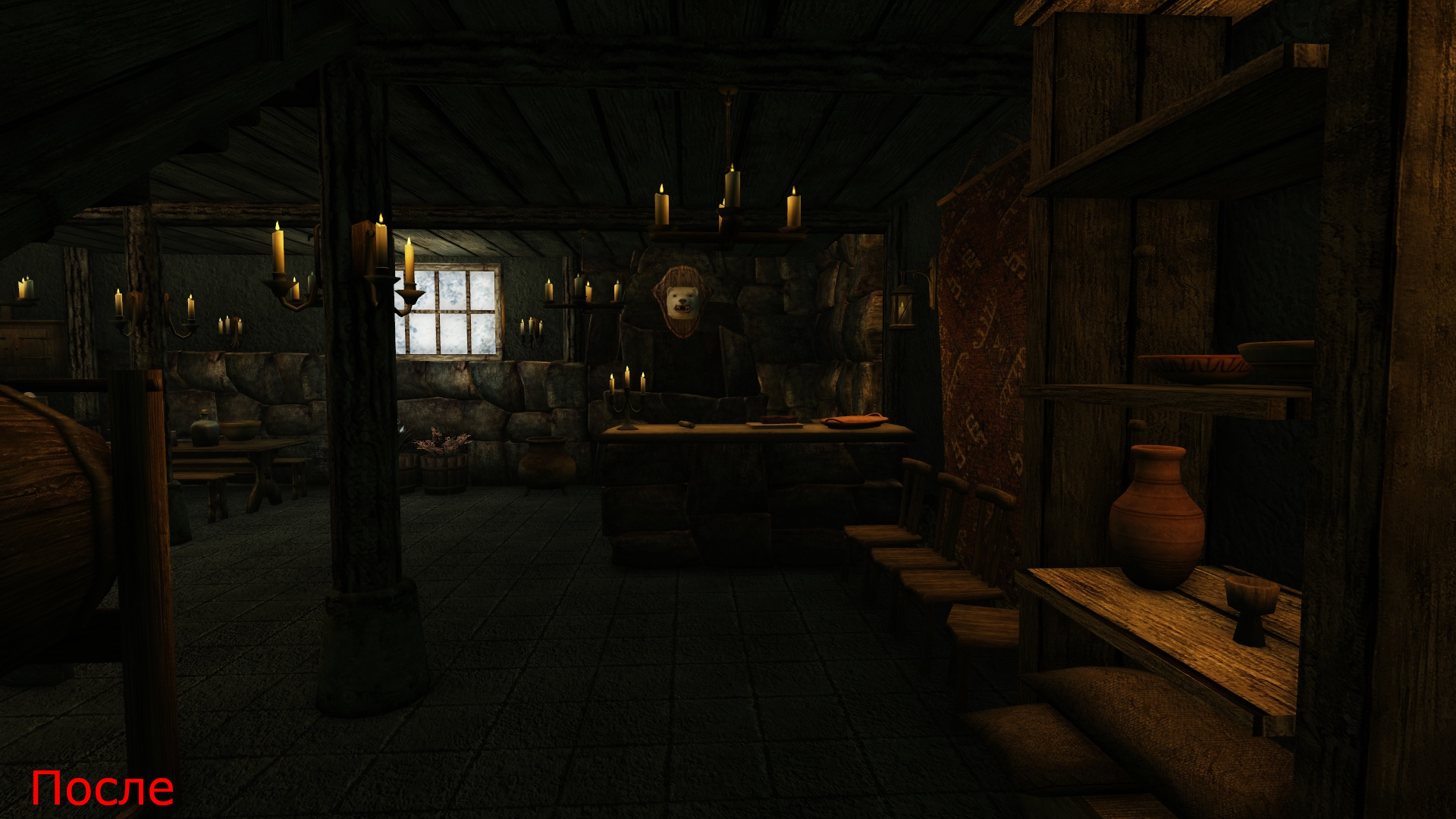 Все источники света, не имеющие физического источника, были удалены, вместо них установлены дополнительные лампы и свечи в необходимых местах.