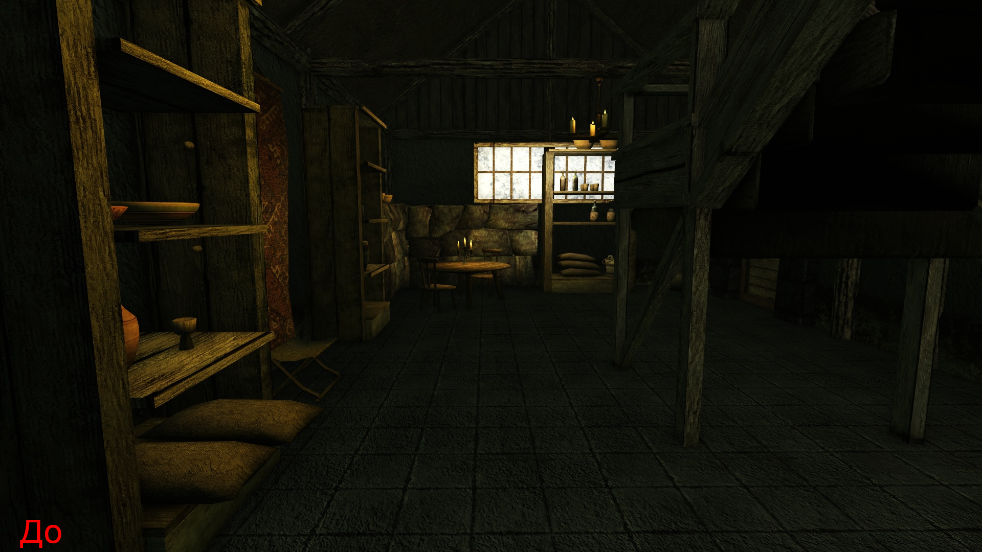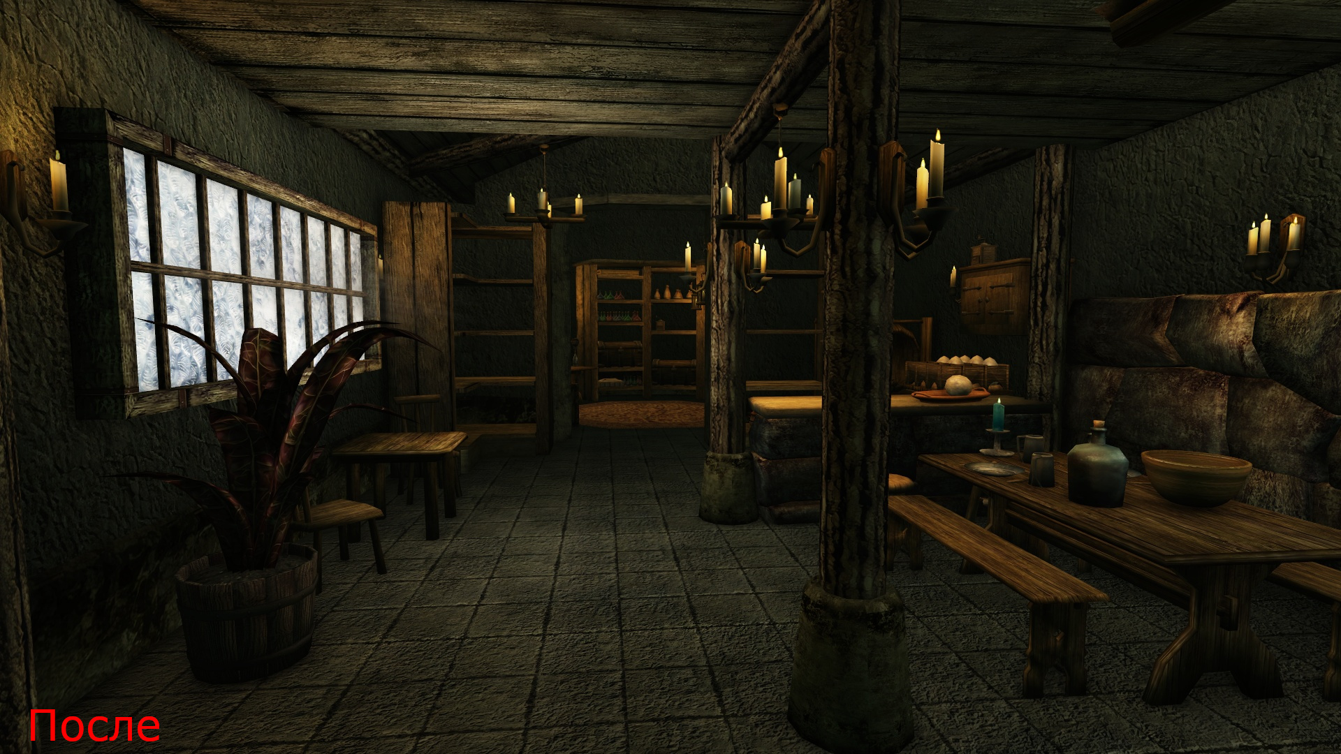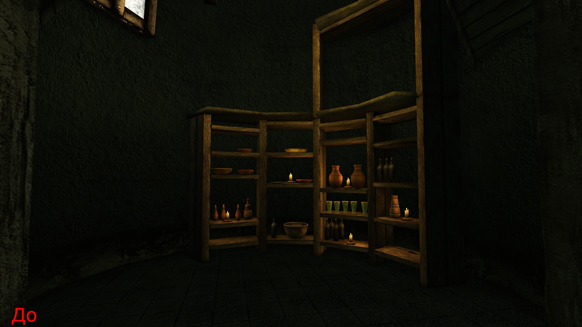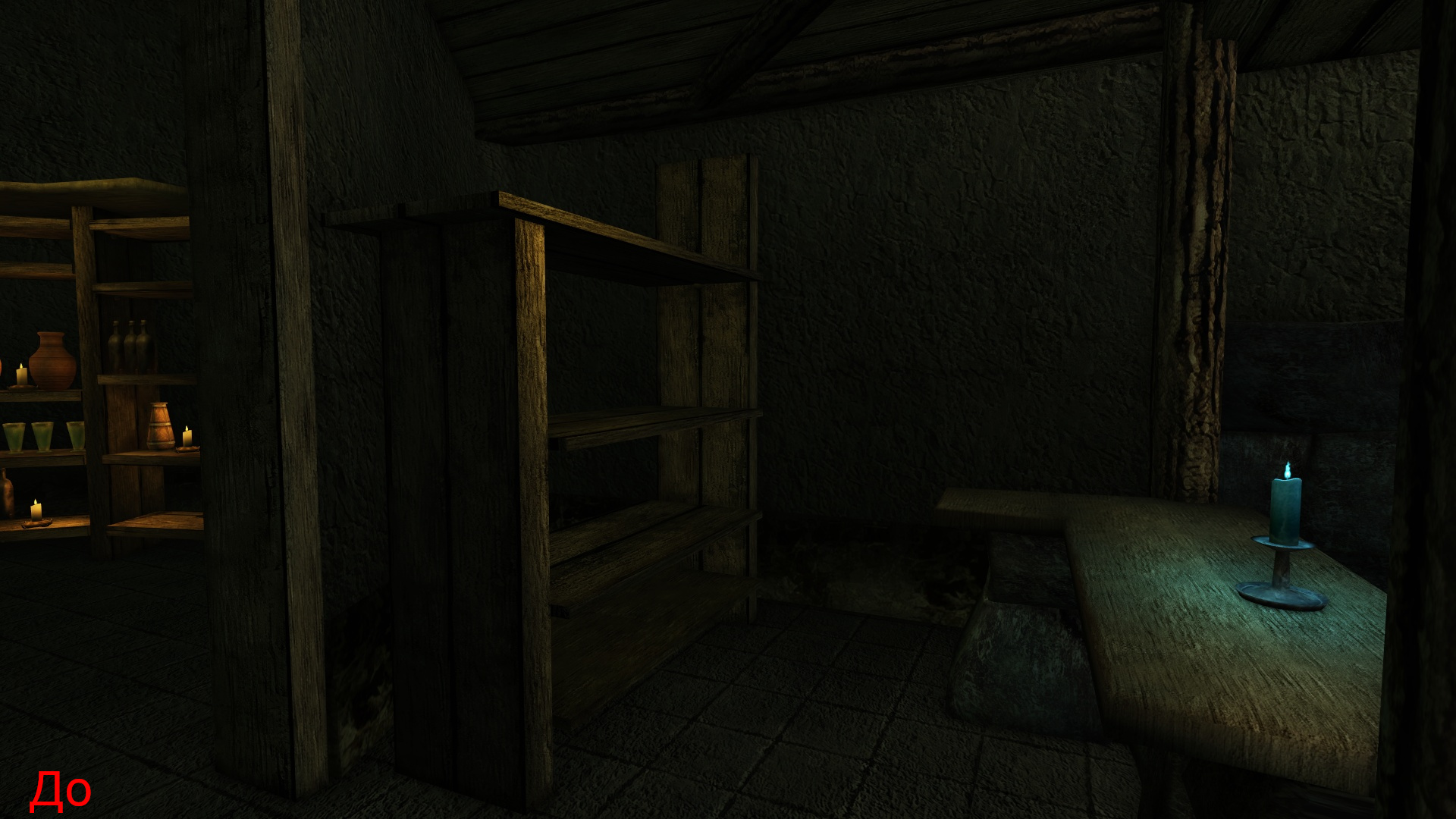 Все источники света, не имеющие физического источника, были удалены, вместо них установлены дополнительные лампы и свечи в необходимых местах.