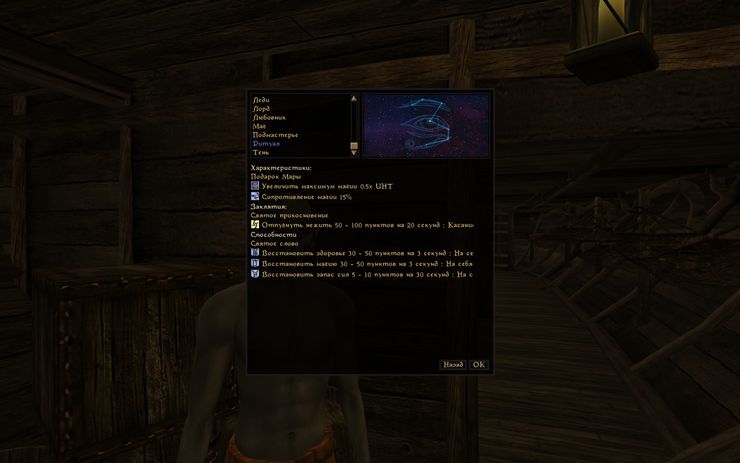 Этот мод переделывает созвездия и расы Морровинда. Я старался сохранить идеи заложенные в оригинале, а также соблюсти возможность чтобы каждый знак был полезен любому классу. Каждый знак, каждая раса по настоящему индивидуальны и гораздо лучше сбалансированы.