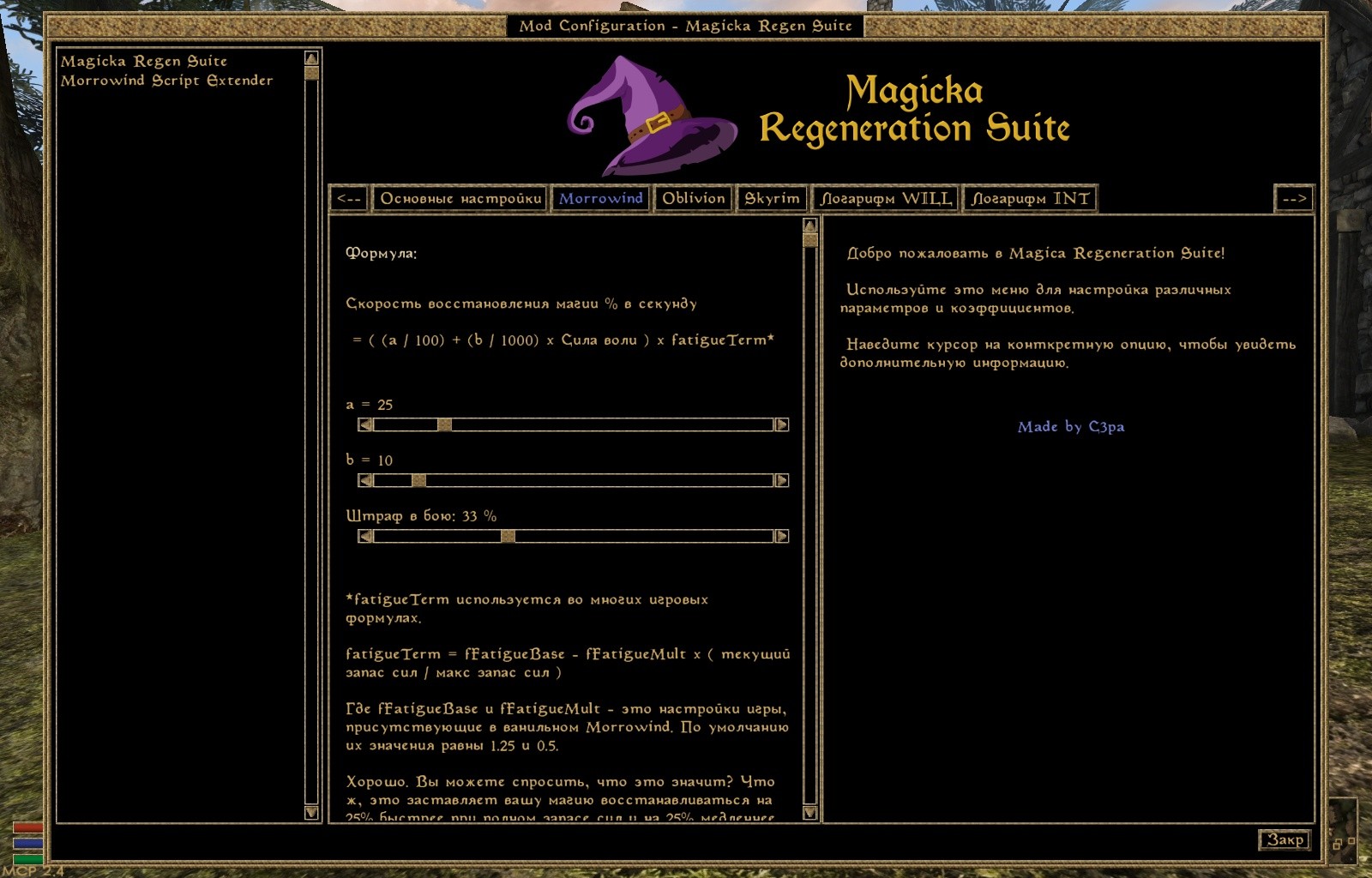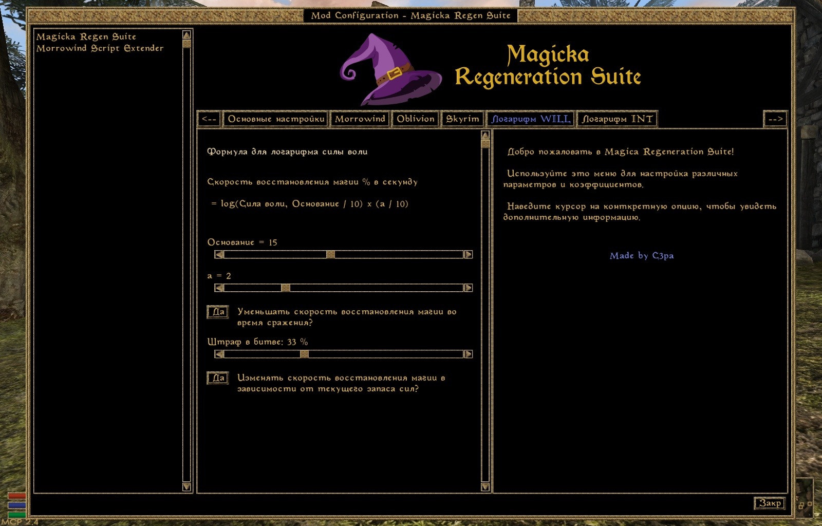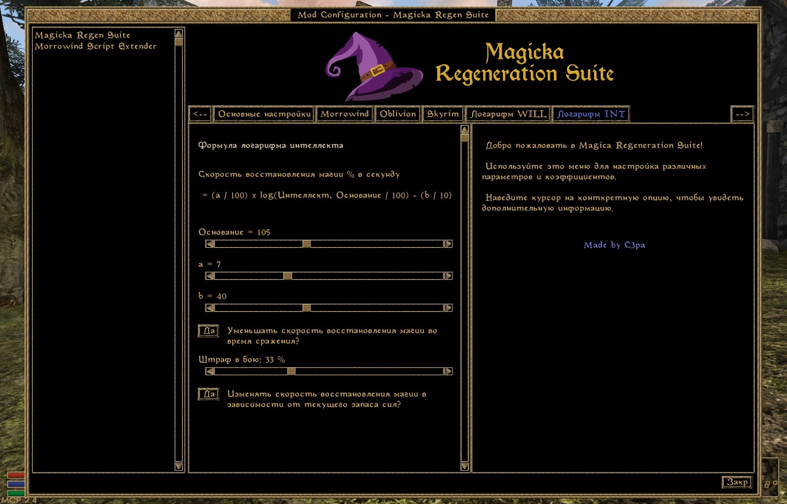 Логарифм интеллекта: Скорость восстановления зависит только от интеллекта. При настройках по умолчанию, небольшие значения интеллекта, около 15, приведут к инвертированию скорости регенерации магии. т.е. магия будет уменьшаться со временем.