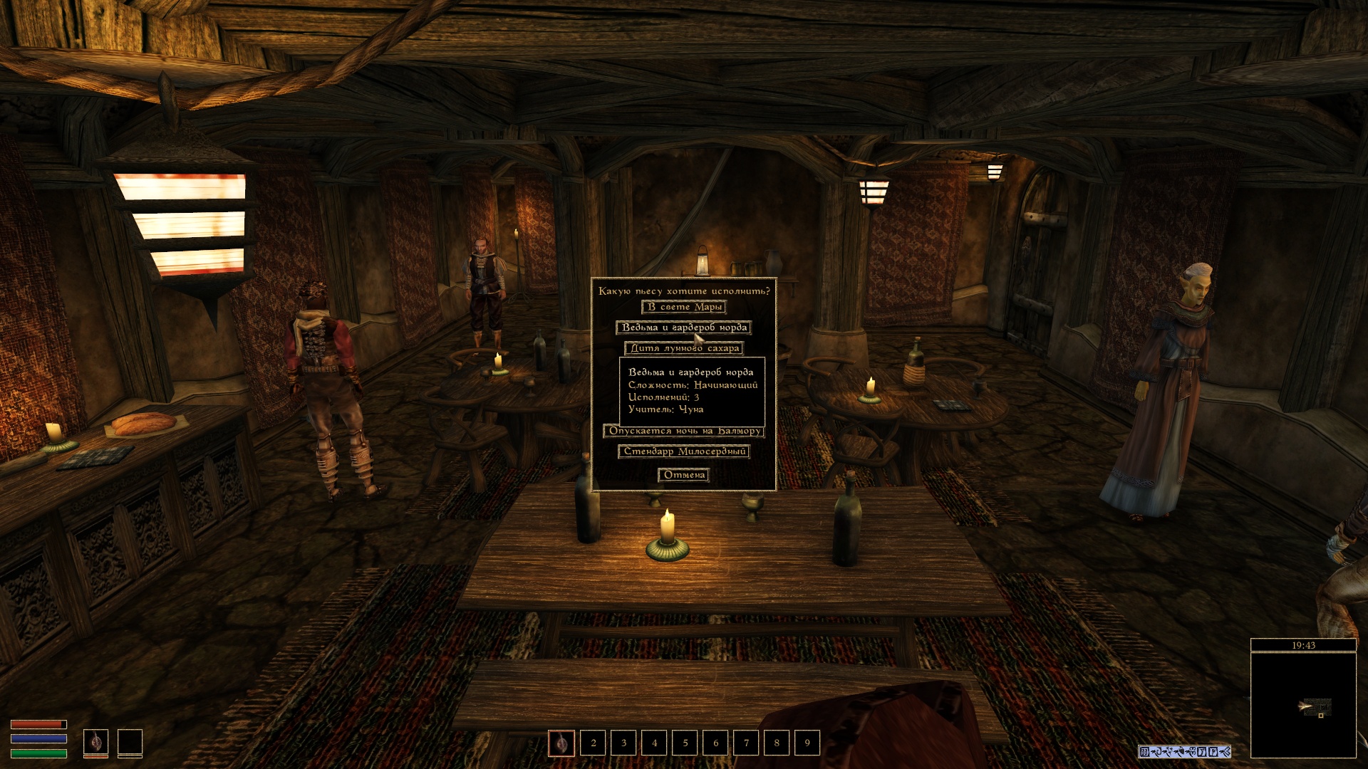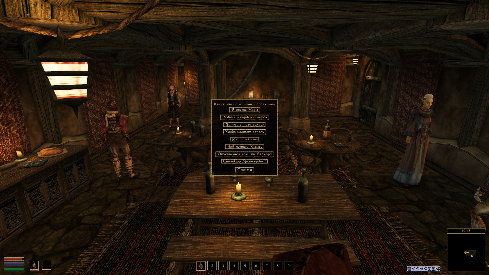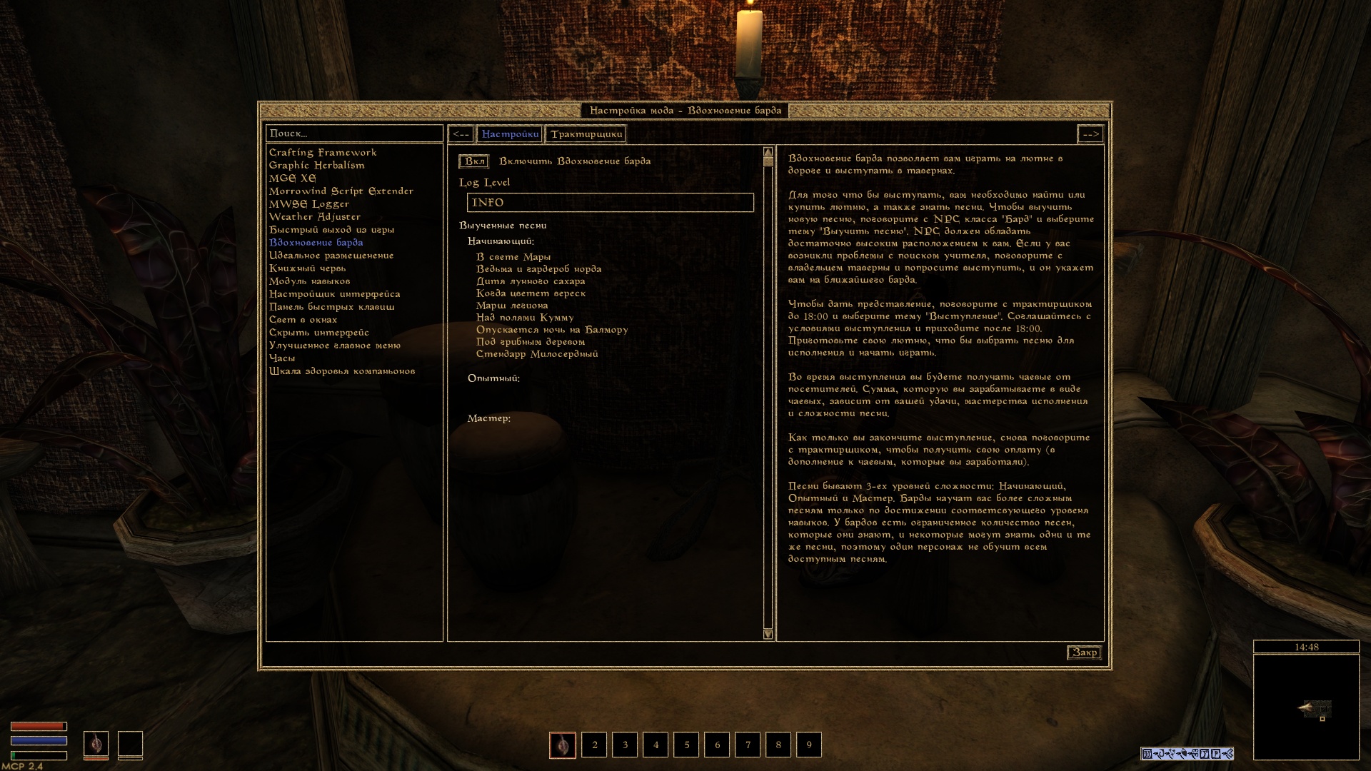 Данный мод добавляет возможность играть на лютне. Можно играть в дороге или выступать за деньги в тавернах и трактирах.