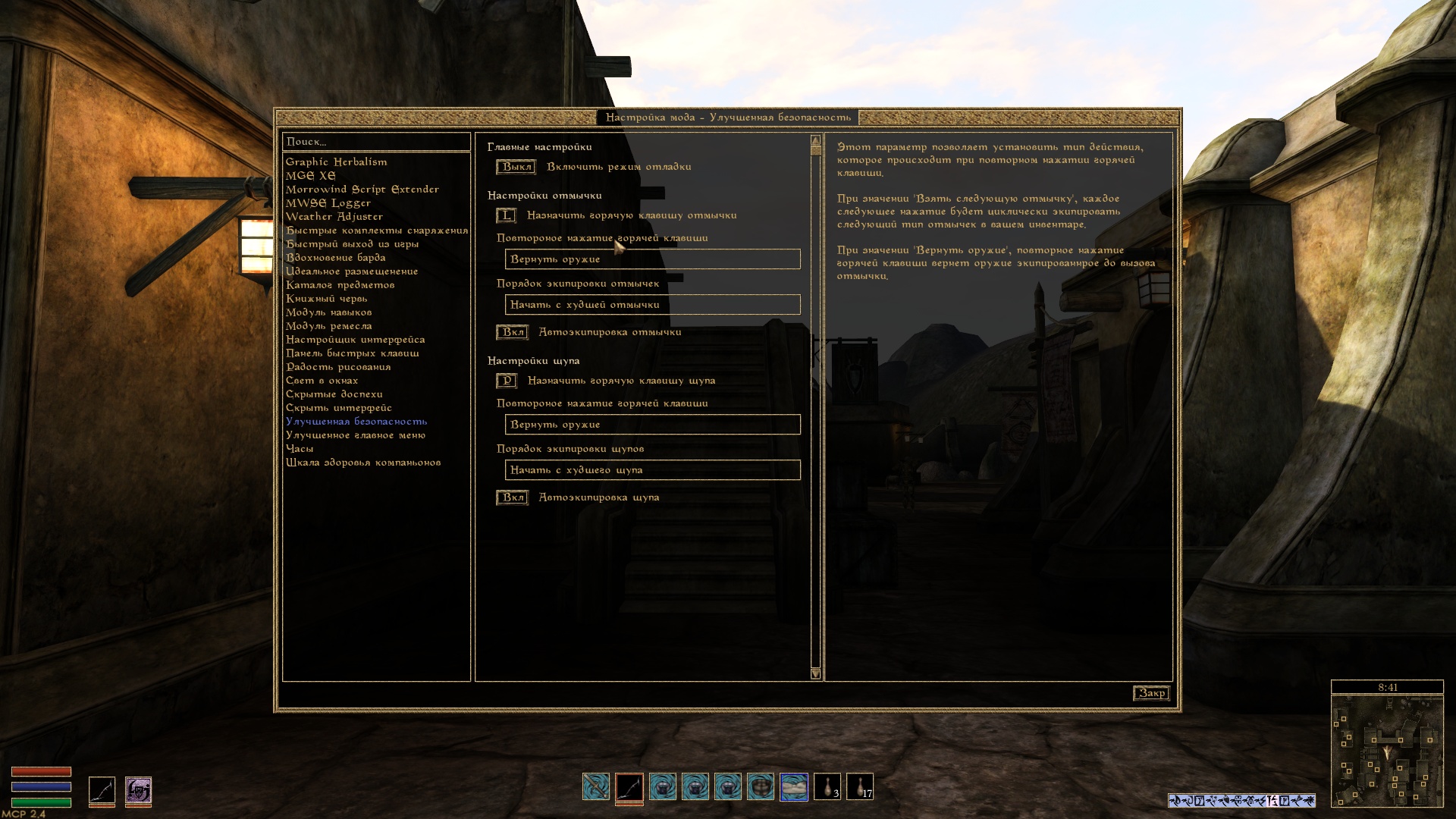 В меню настройки модов для отмычек и щупов можно настроить следующие параметры: