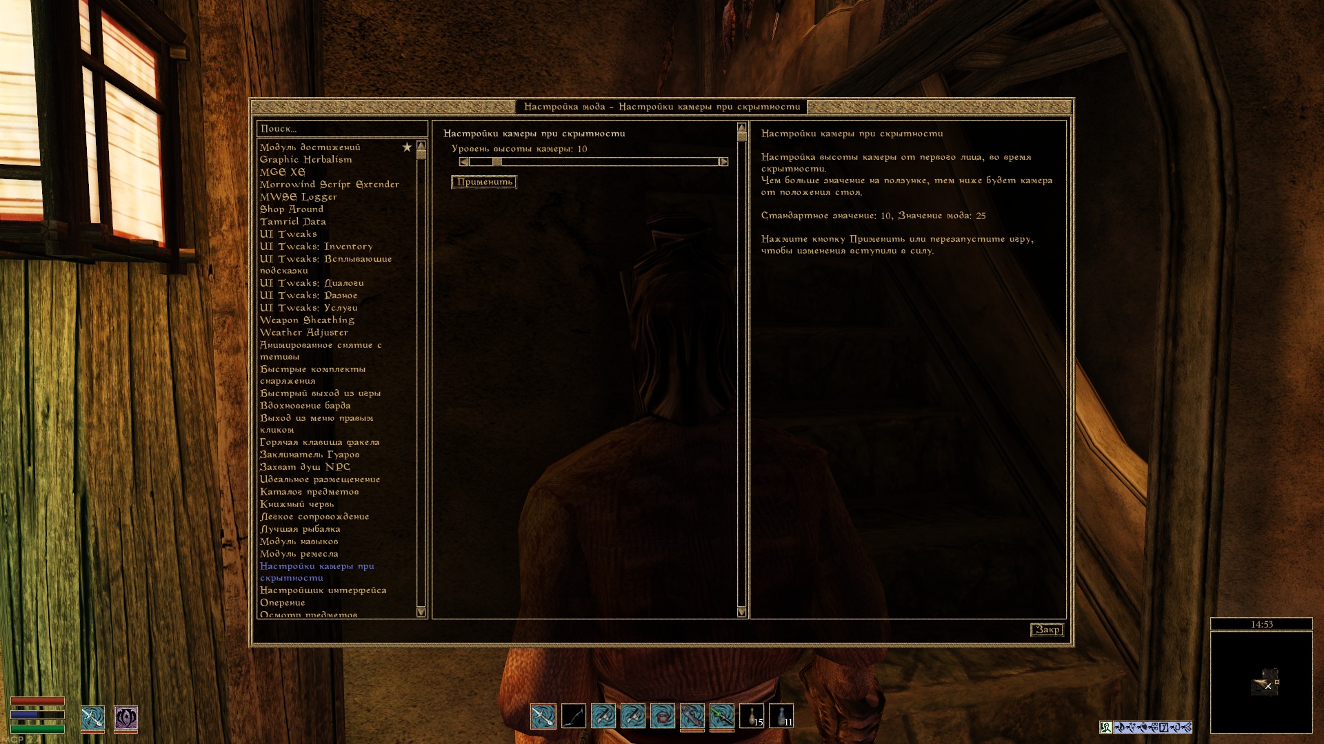 Мод позволяет "на лету" настраивать уровень камеры от первого лица для режима скрытности в меню настроки модов.
