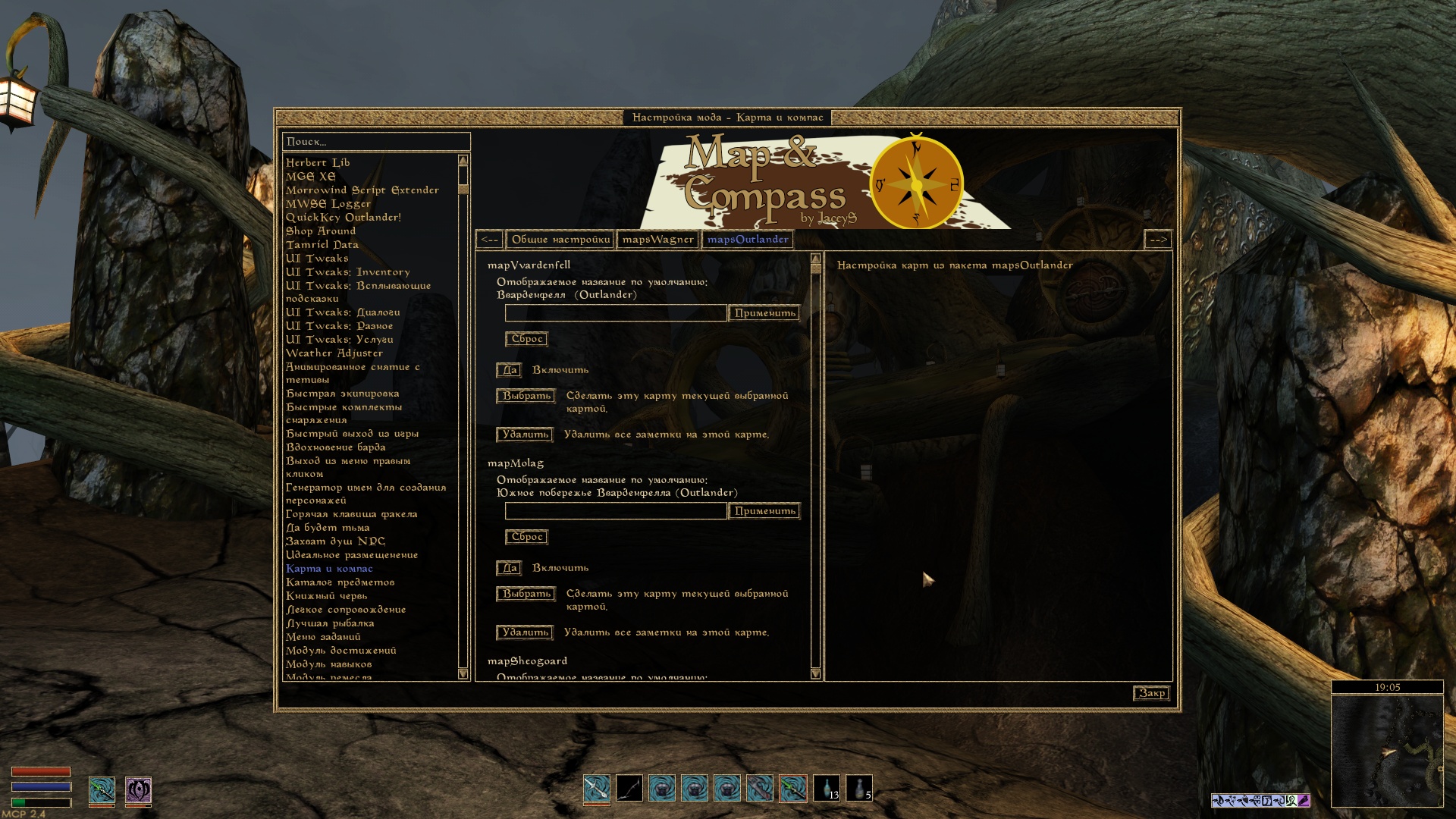 Затем нужно открыть файл Morrowind\Data Files\MWSE\config\Map and Compass.json в простом текстовом редакторе (например блокноте). Найти строку "mapPacks":["mapsWagner","mapsOutlander"] и добавить имя папки пакета карт (в кавычках) в список внутри скобок, разделяя каждую запись запятой. Сохранить Map and Compass.json.