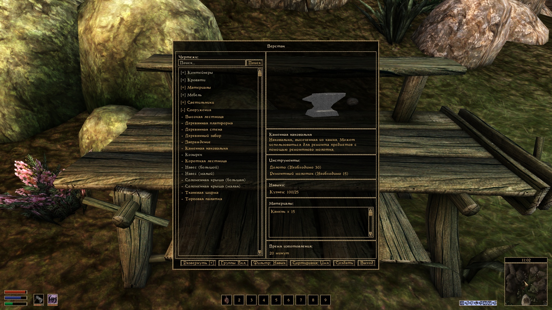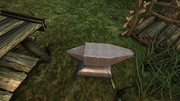 Для изготовления каменной наковальни требуется верстак, ремонтный молоток, долото и 15 шт. камня. Чертеж доступен в меню верстака.