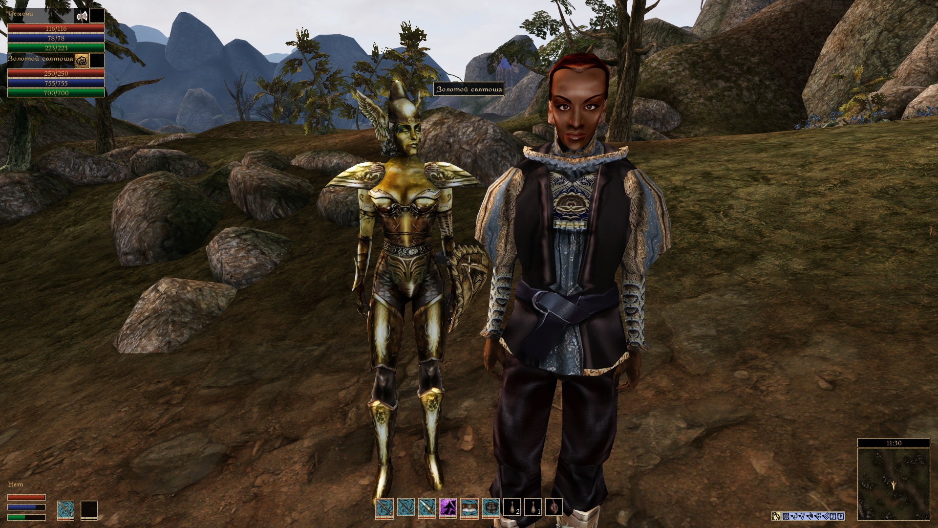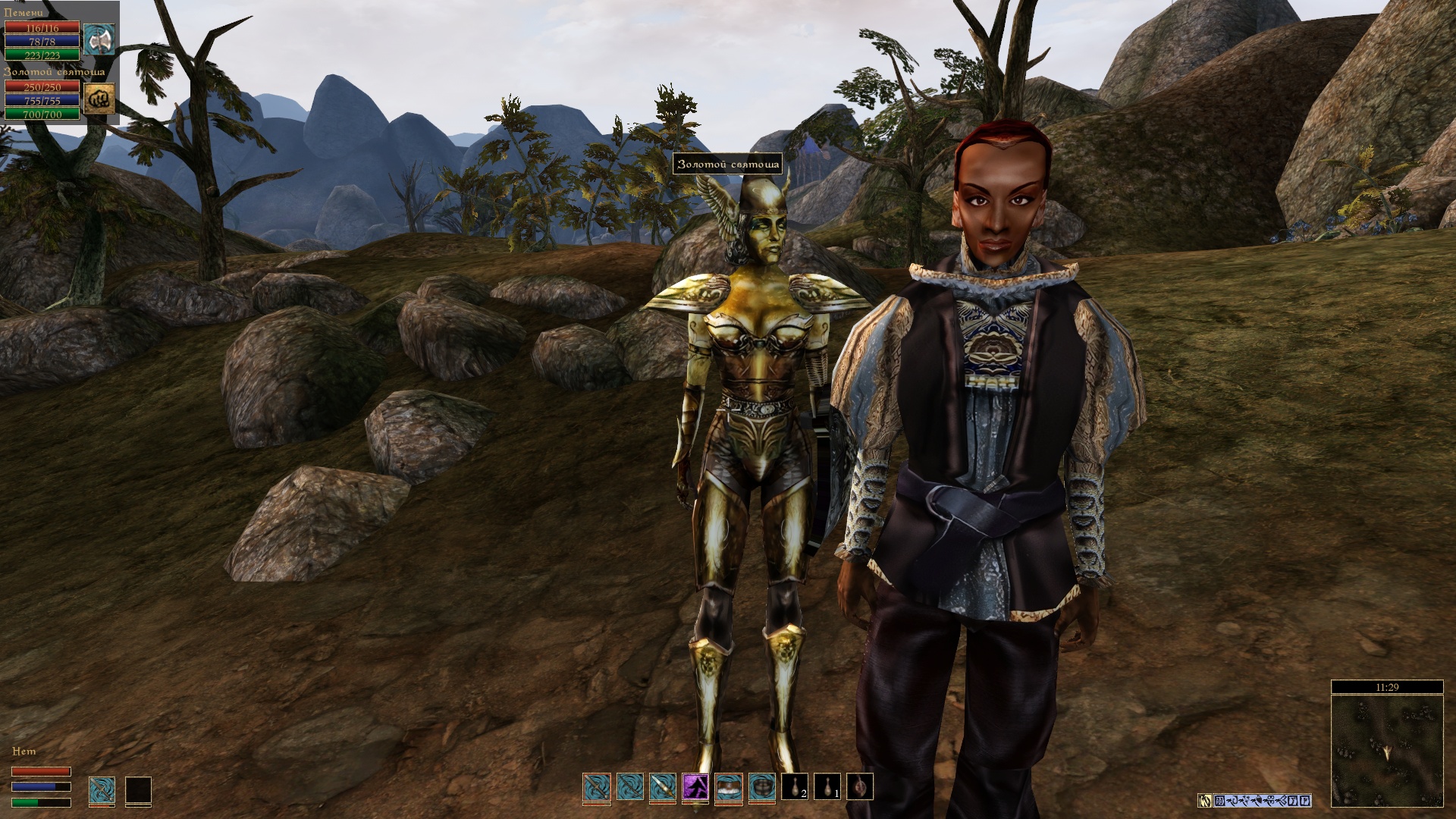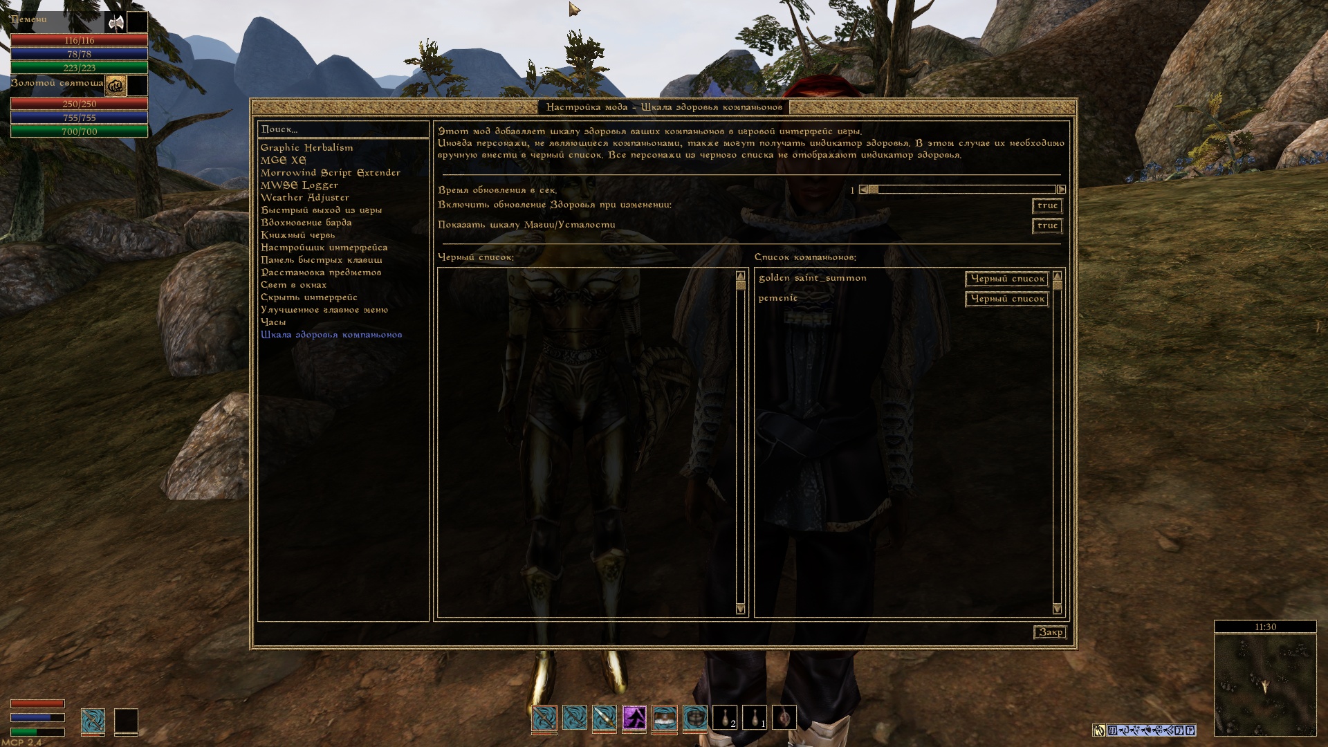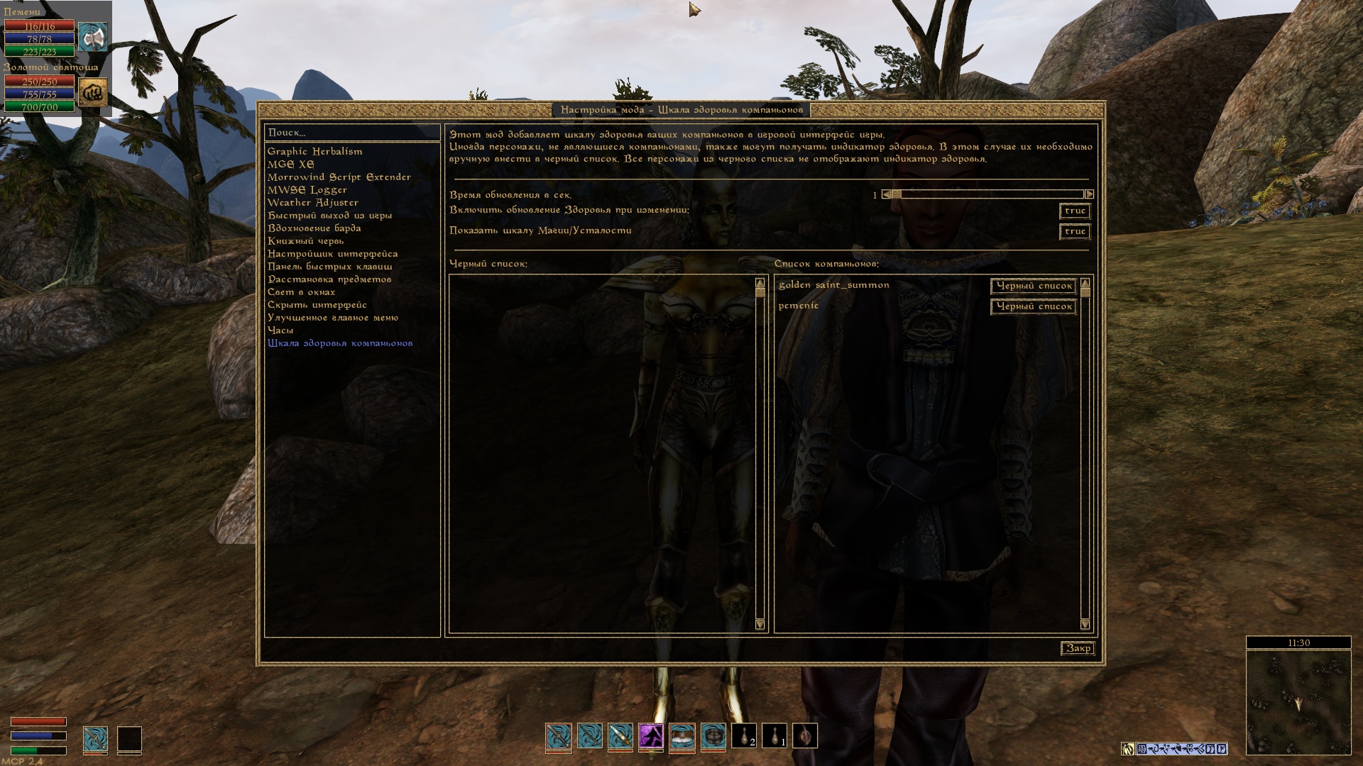 Этот мод добавляет шкалу здоровья, магии, усталости, а также экипированное оружие ваших компаньонов и призванных существ.