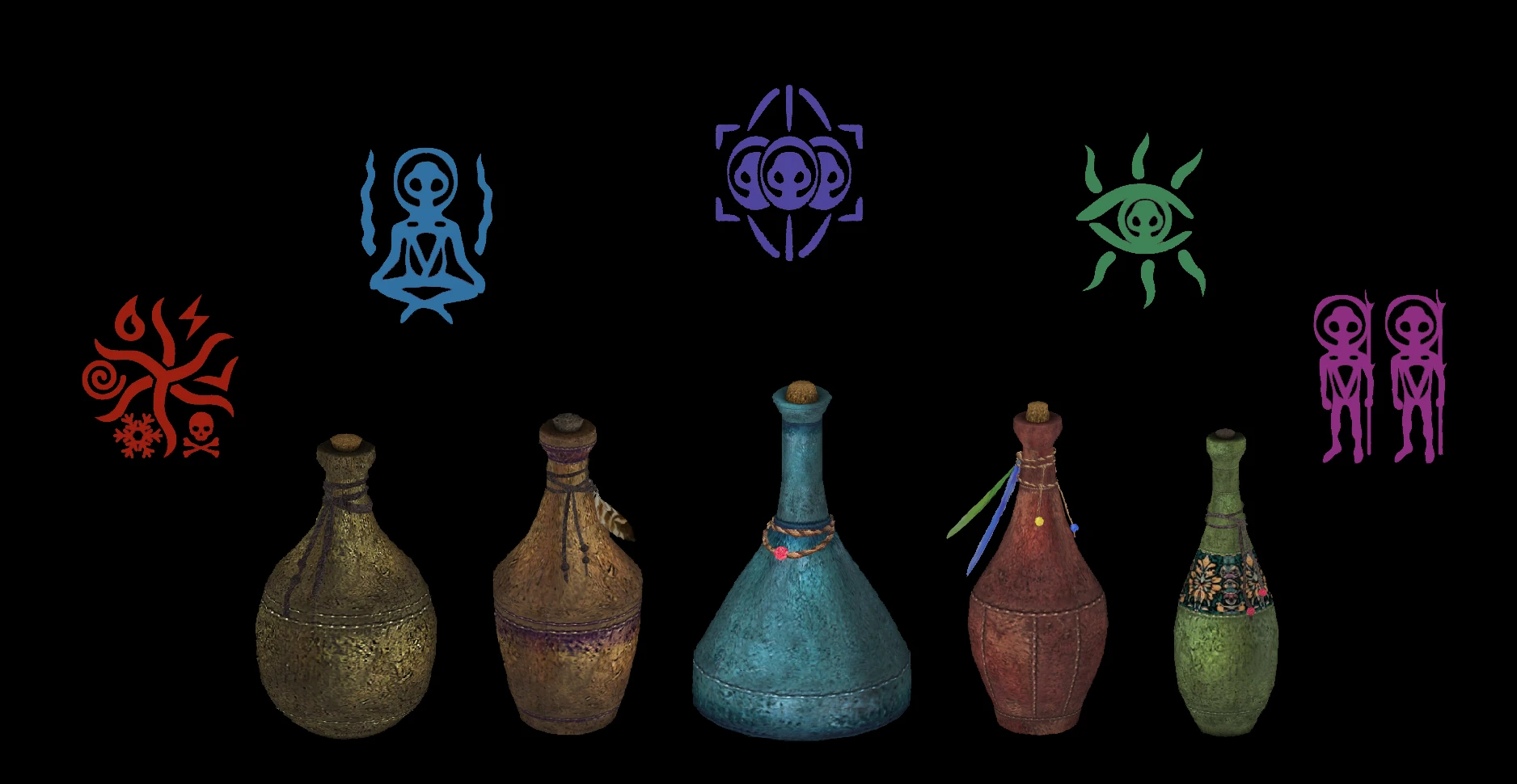 Изначально мне хотелось создать целый язык таких символов, где узелки или бусины означали бы школы магии и количество эффектов. Но для всех возможных сочетаний пришлось бы сделать больше шести сотен разных моделей, поэтому пришлось остановится на чем-то попроще: форма, как обычно, означает качество, а иконка — магические школы.
