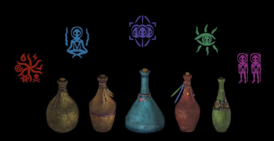 Идея для мода родилась из образа алхимика-скитальца. Того, кто творит свои снадобья не в стерильных лабораториях Гильдии магов, а в пути: колдуна, паломника или изгоя. У него нет под рукой ни стеклодува, ни готовых склянок с этикетками, ни надёжной крыши над головой — только то, что может унести с собой. Поэтому зелья он варит в простой глиняной посуде, а чтобы не перепутать, отмечает их подручными знаками: узелок на верёвке, бусина, перо.