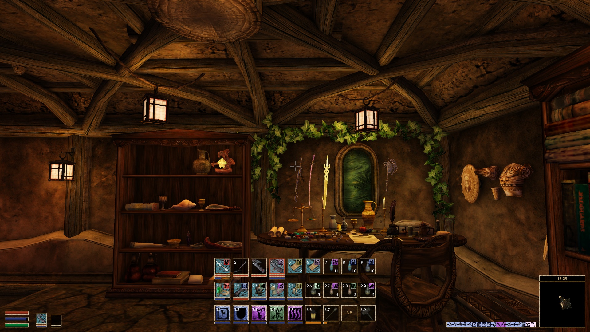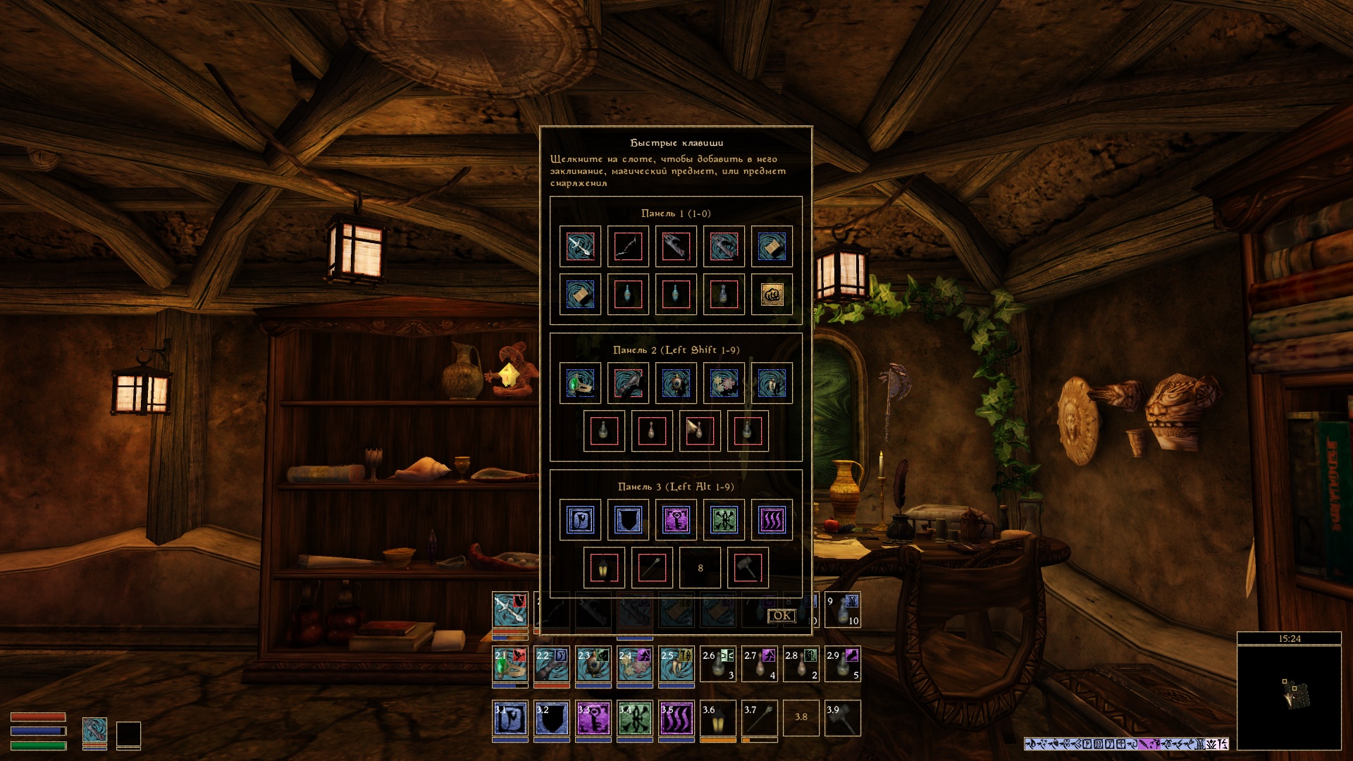 Не совместимо с "Панель быстрых клавиш"(QuickKeys Hotbar - MWSE) и "Hotkeys Extended", является их компиляцией.