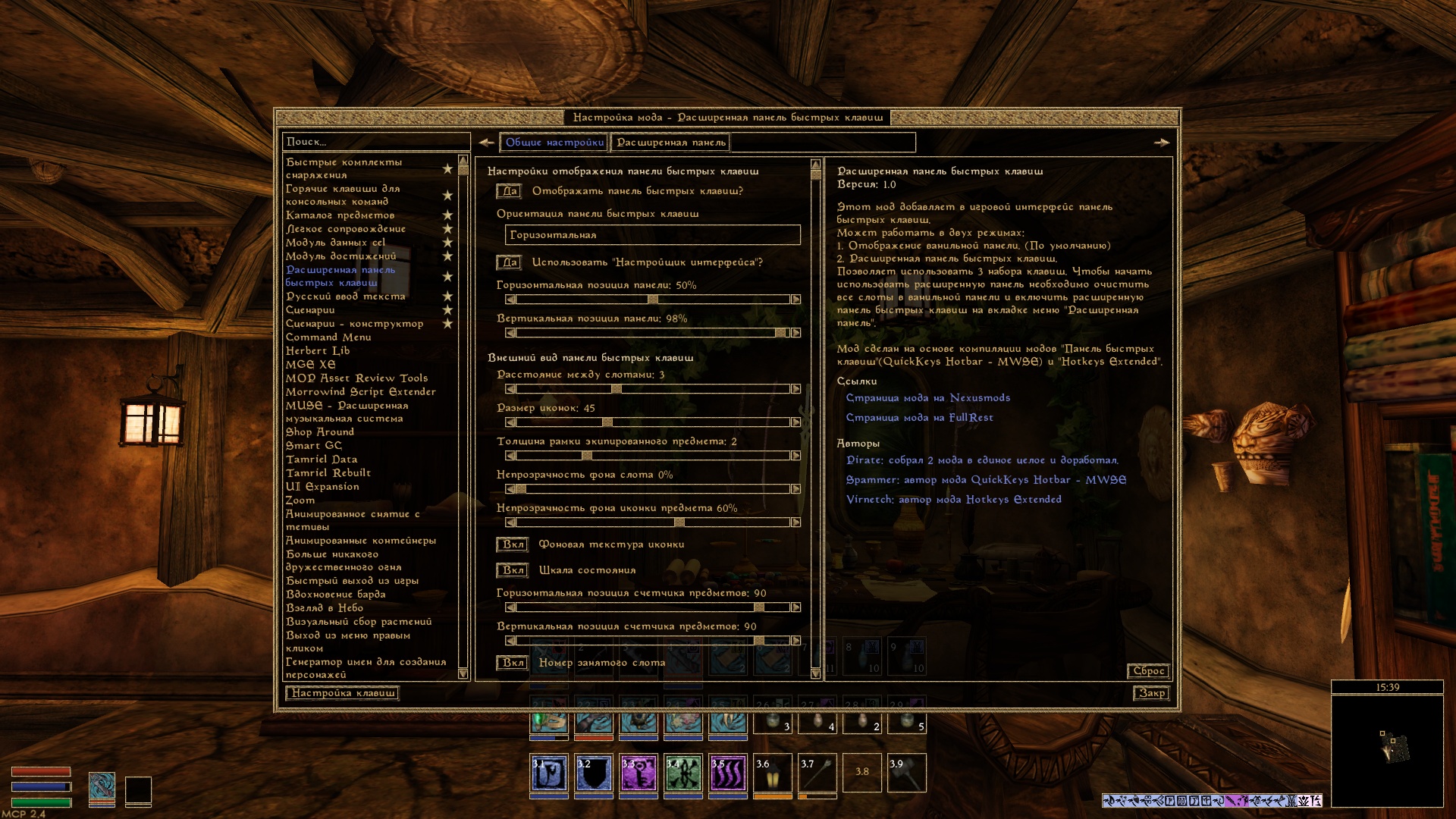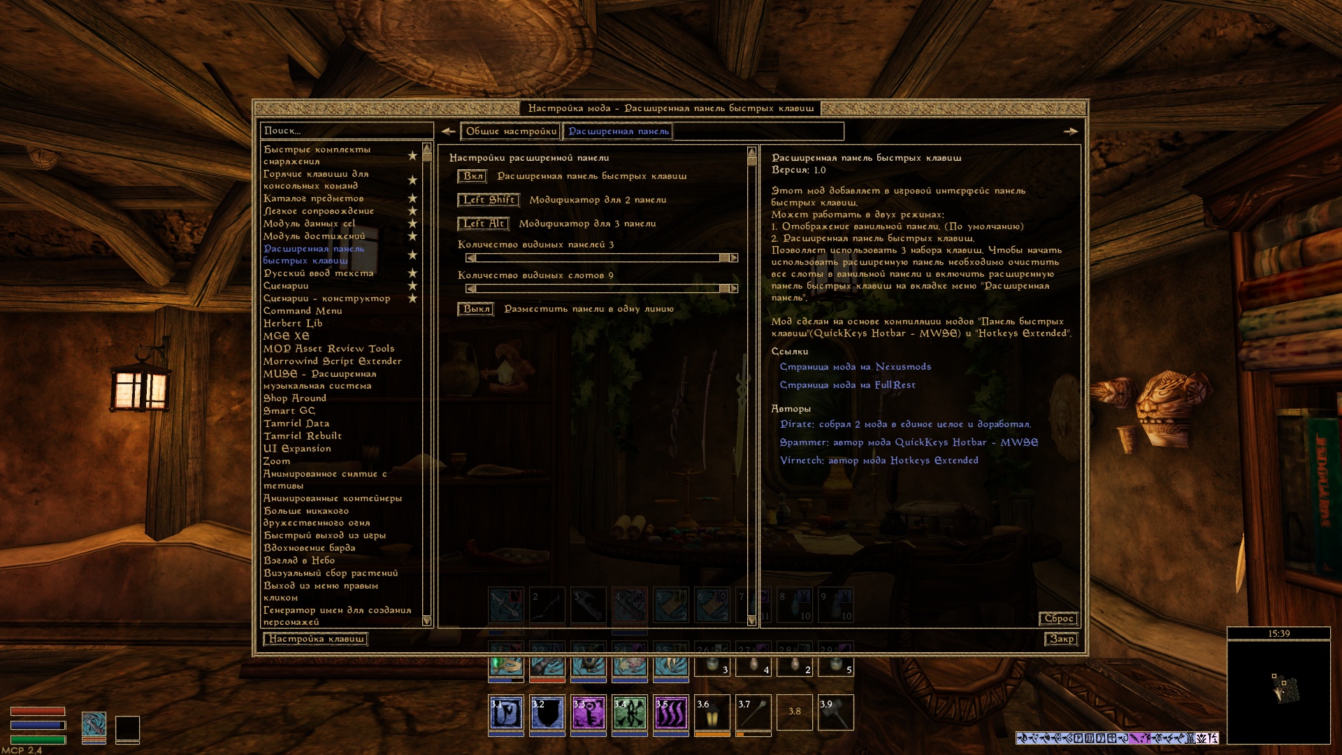 Мод является компиляцией модов "Панель быстрых клавиш"(QuickKeys Hotbar - MWSE) и "Hotkeys Extended" , с моими личными доработками.