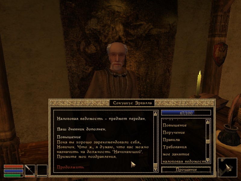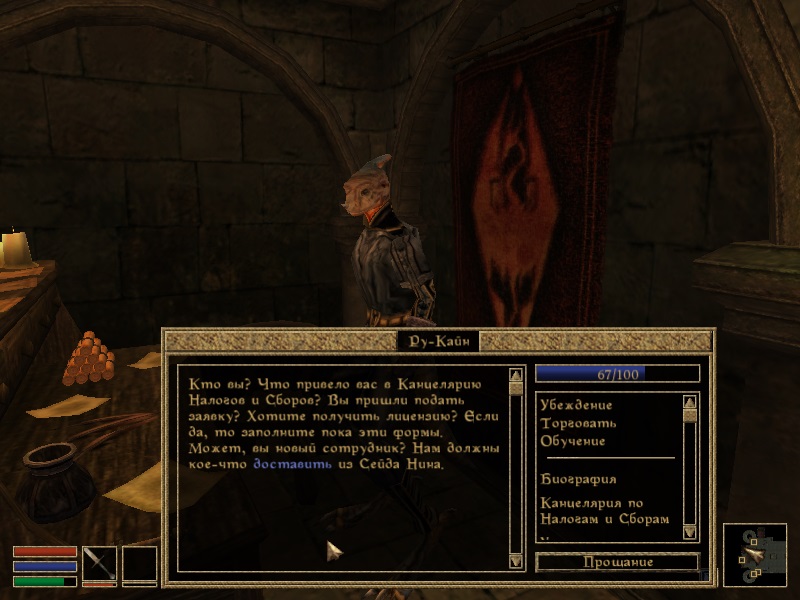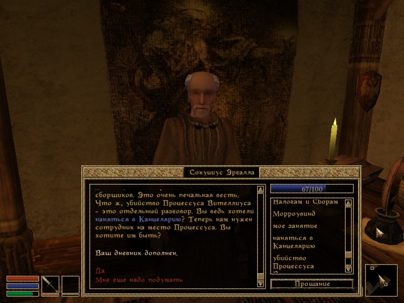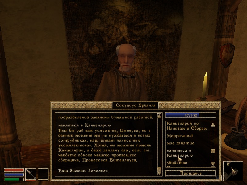 Чтобы вступить в Канцелярию, нужно для начала порасспрашивать Сокуциуса о Биографии. После этого в диалоге появится соответствующий топик. Но сразу инспектор не примет вас в штат, ведь все места заняты. Хотя, возможно, если вы поможете Эргалле в расследовании исчезновения Процессуса Вителлиуса, то вам улыбнется удача. После выполнения стандартного задания, когда вы сообщите Сокуциусу о смерти сборщика налогов, вам предоставят возможность стать членом Канцелярии.