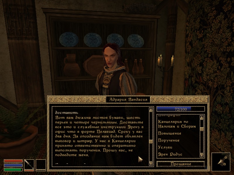 После вступления у инспектора можно будет взять задание, которое запустит основную линейку квестов фракции. Всего в плагине 6-7 основных заданий и несколько побочных. Почти каждый квест привязан к времени и его можно провалить, если замешкаться (никто не будет ждать БУМАГИ, пока вы решите сходить покачаться в пещеру). Так же у каждого задания есть несколько путей его выполнения. Бонусом вы можете взять задание у аргонианина Ру-Кайна, а одно задание активируется, если игрок не успел во время выполнить поручение Эрена.