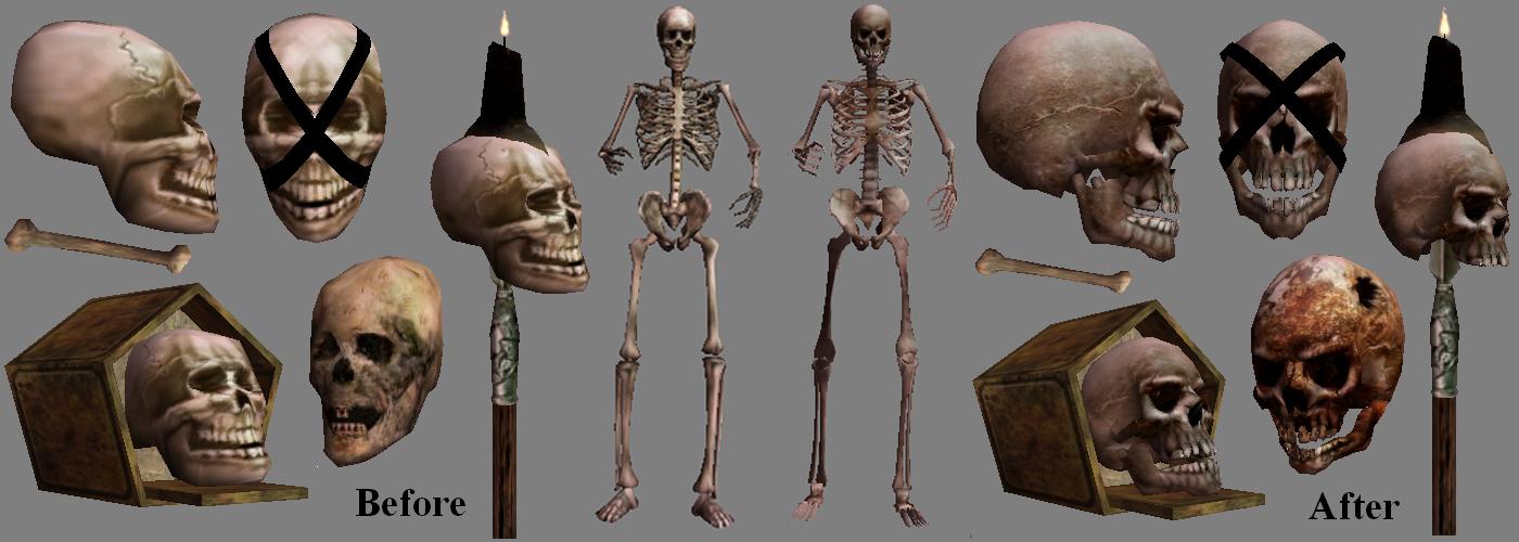 Заменяет всех скелетов и их кости на более качественные.