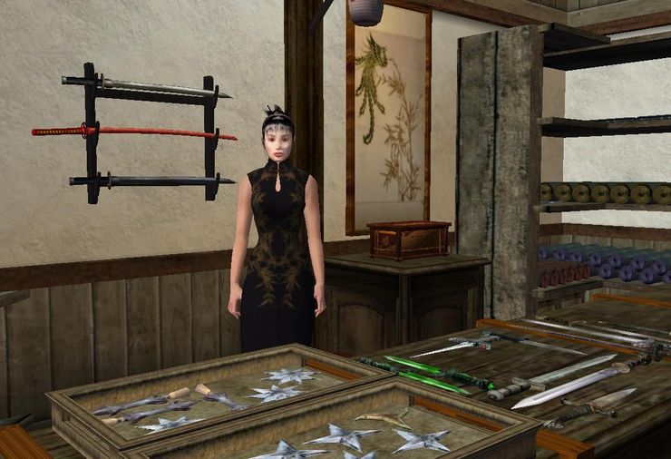 и ещё кое-что. Вид магазина и продавца выдержаны в японском духе. Вас встретит NPC по имени Ксиа, которая продаёт одежду, броню и оружие.