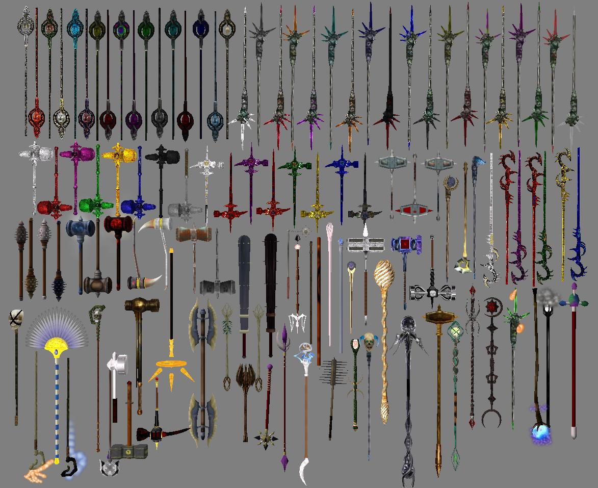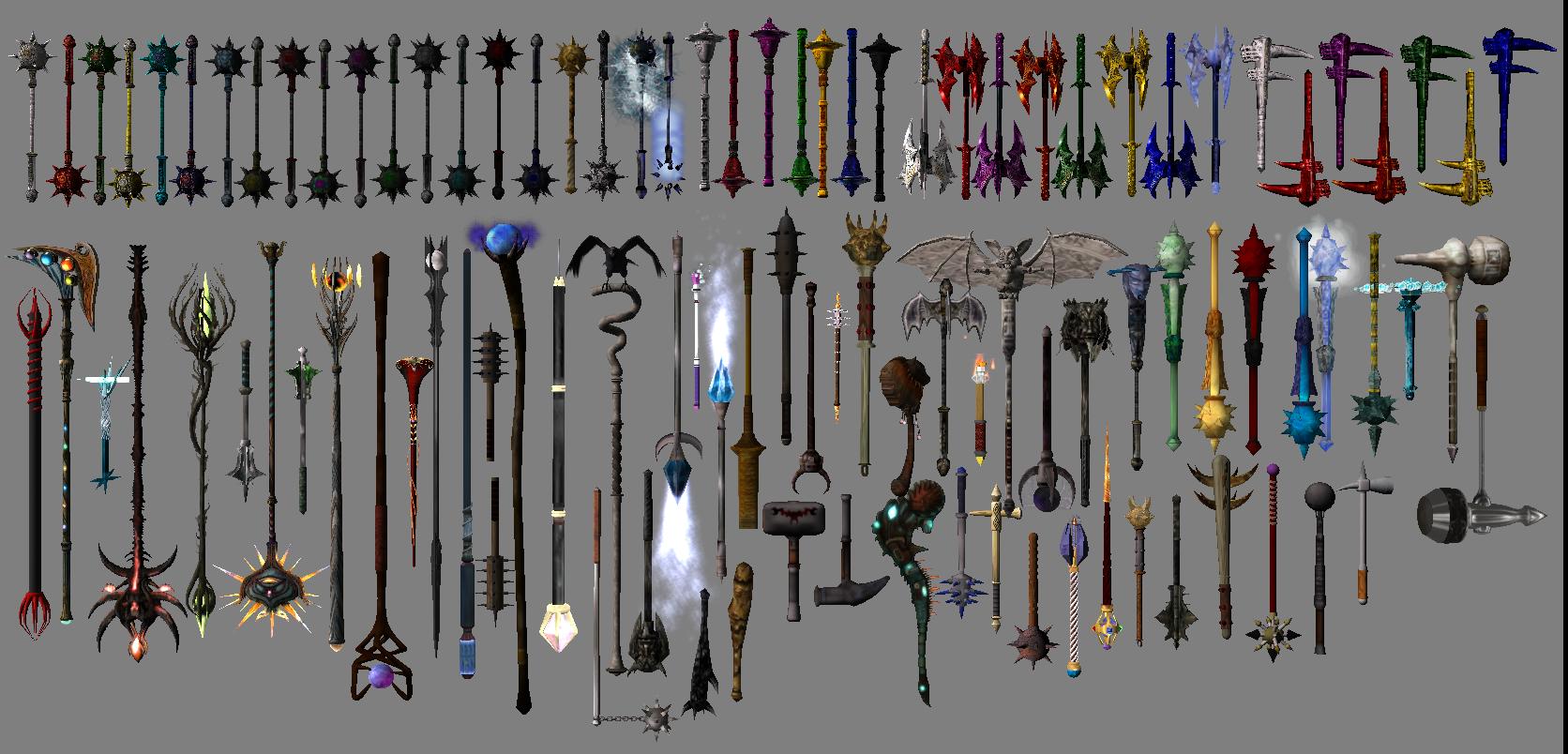 Мод представляет из себя большую компиляцию разных лучших вещей из модов, посохи, молоты и другое дробящее оружие. Они добавлены в левел-листы, НПС и в магазины торговцам. Обязательно воспользутесь программой levelled list merger, которую можно взять на сайте в разделе Программы для Морровинда.