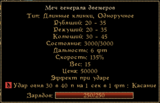 Физический урон 20-45, зачарован на урон огнем 30-40 при ударе.
