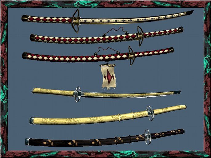 Этот плагин добавляет в игру четыре катаны, два лука и один двуручный меч. У всех мечей имеются ножны, а у луков колчаны. К ним, ко всем, привязаны скрипты, благодаря чему в них вкладывается оружие.