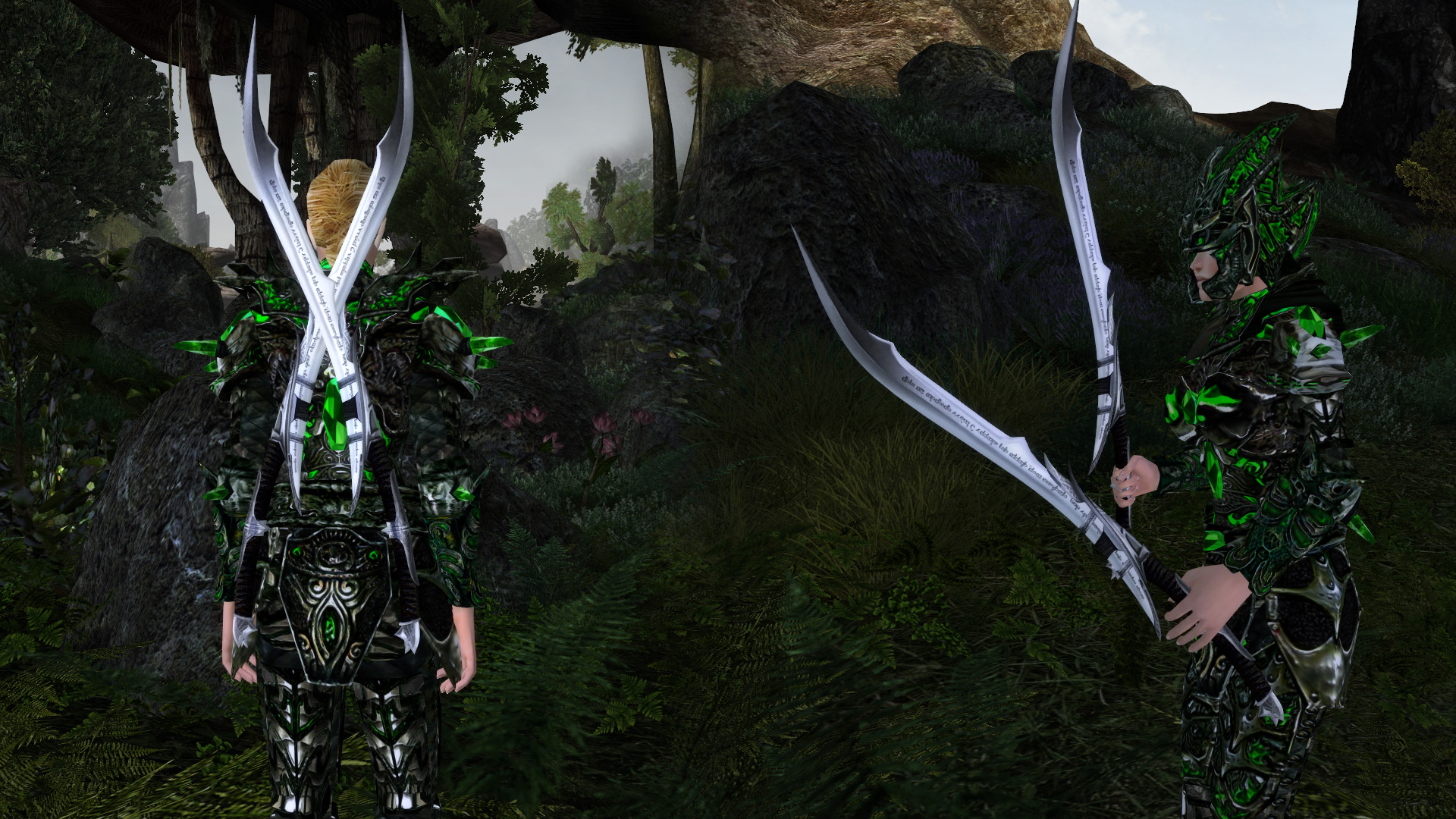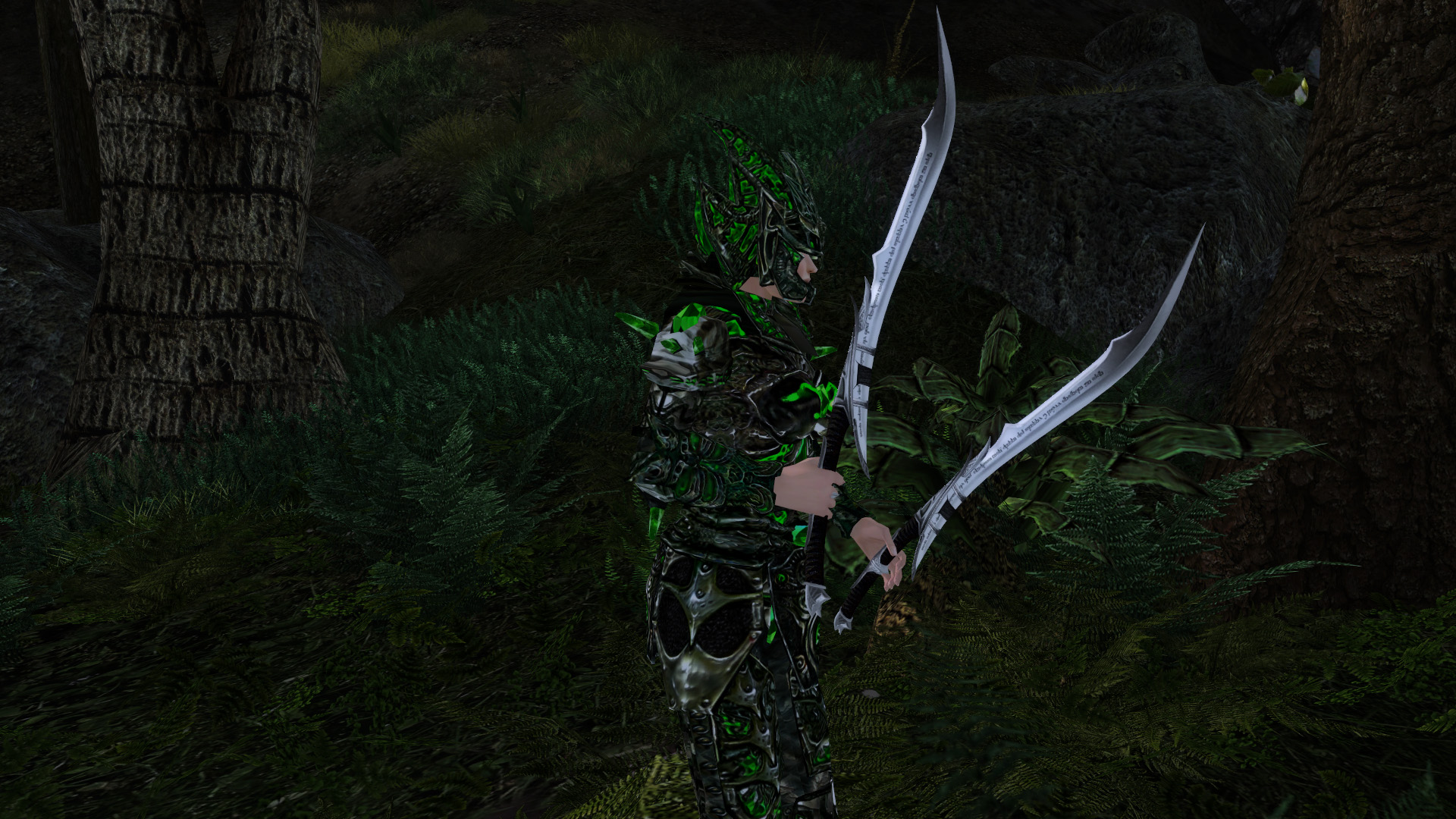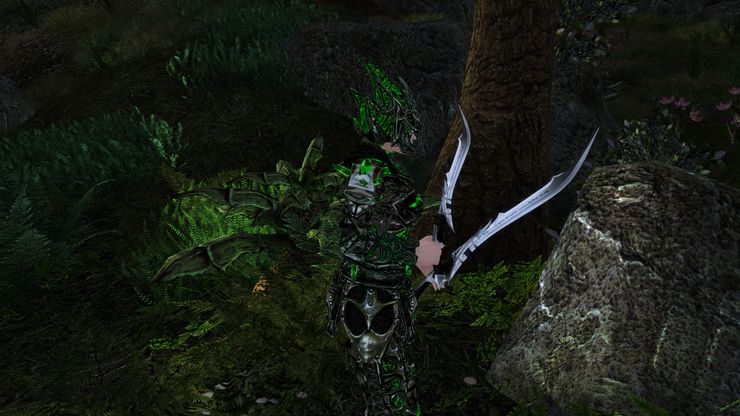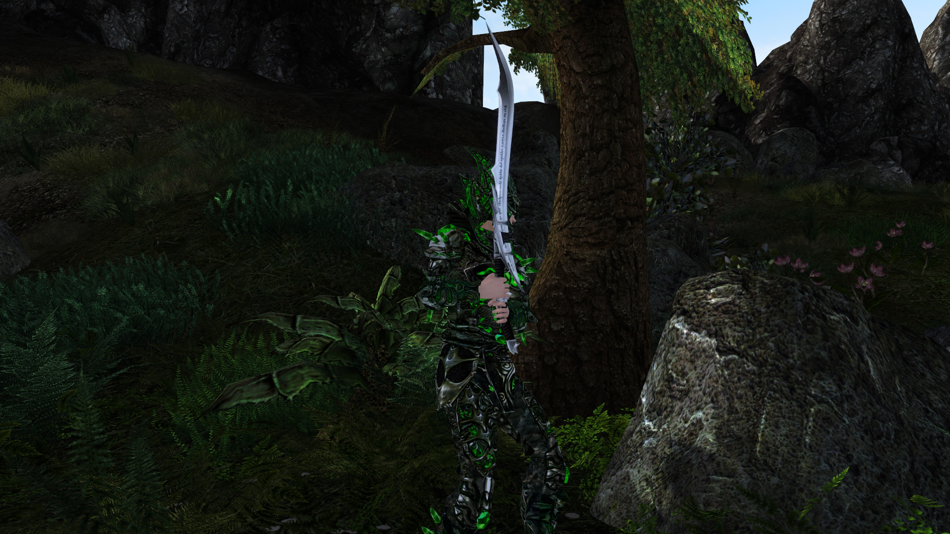 К сожалению, клинок затрагивает слот "шеи", так что носить шлем и мечи одновременно не получится. Это достаточно странно, с учетом того, что изначально модель клинка была привязана таким образом, чтобы одно другому не мешало.