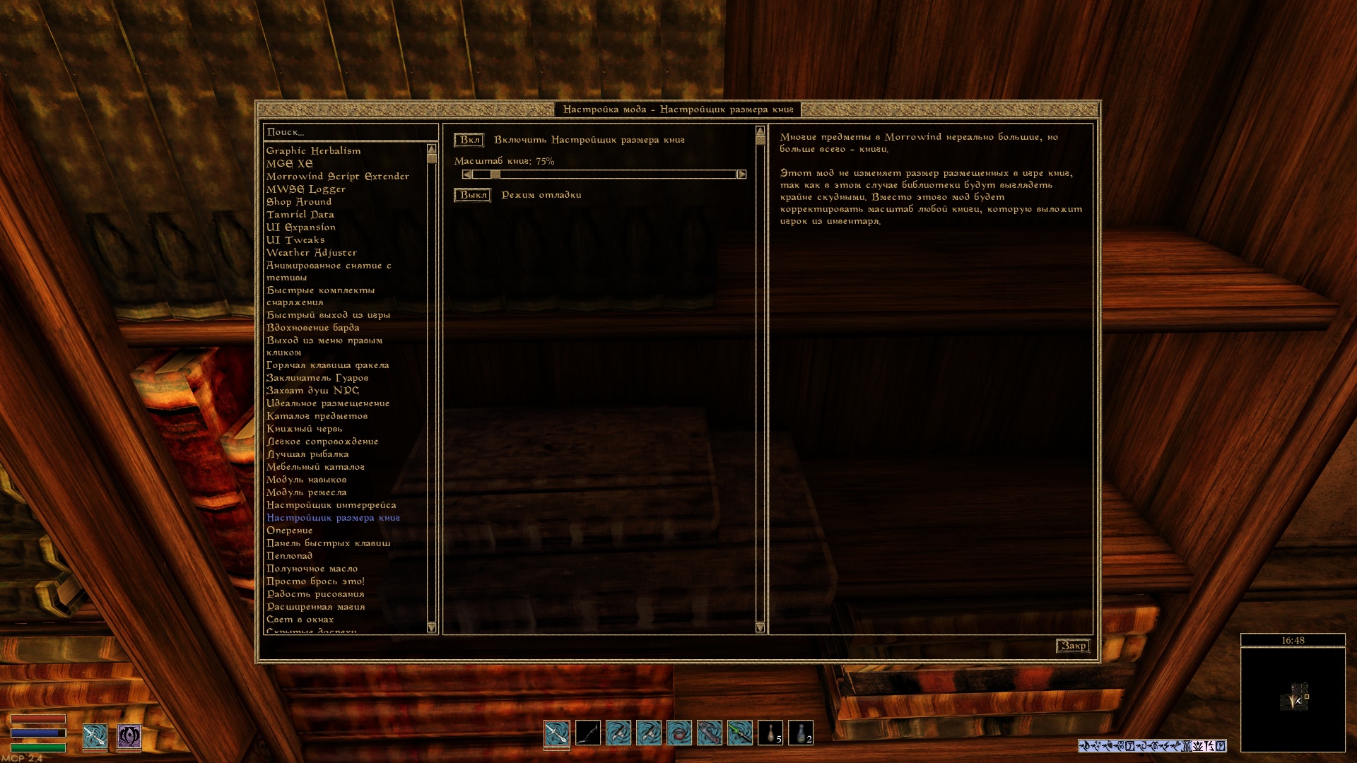 Многие предметы в Morrowind нереально большие, но книги — самые большие. Этот мод призван исправить это, динамически изменяя масштаб книг в момент их размещения до более разумного размера.
