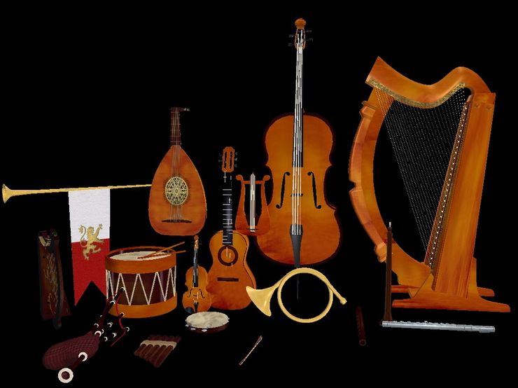 Моддерский ресурс, модели различных музыкальных инструментов: лира, лютня, флейта, арфа и другие инструменты.