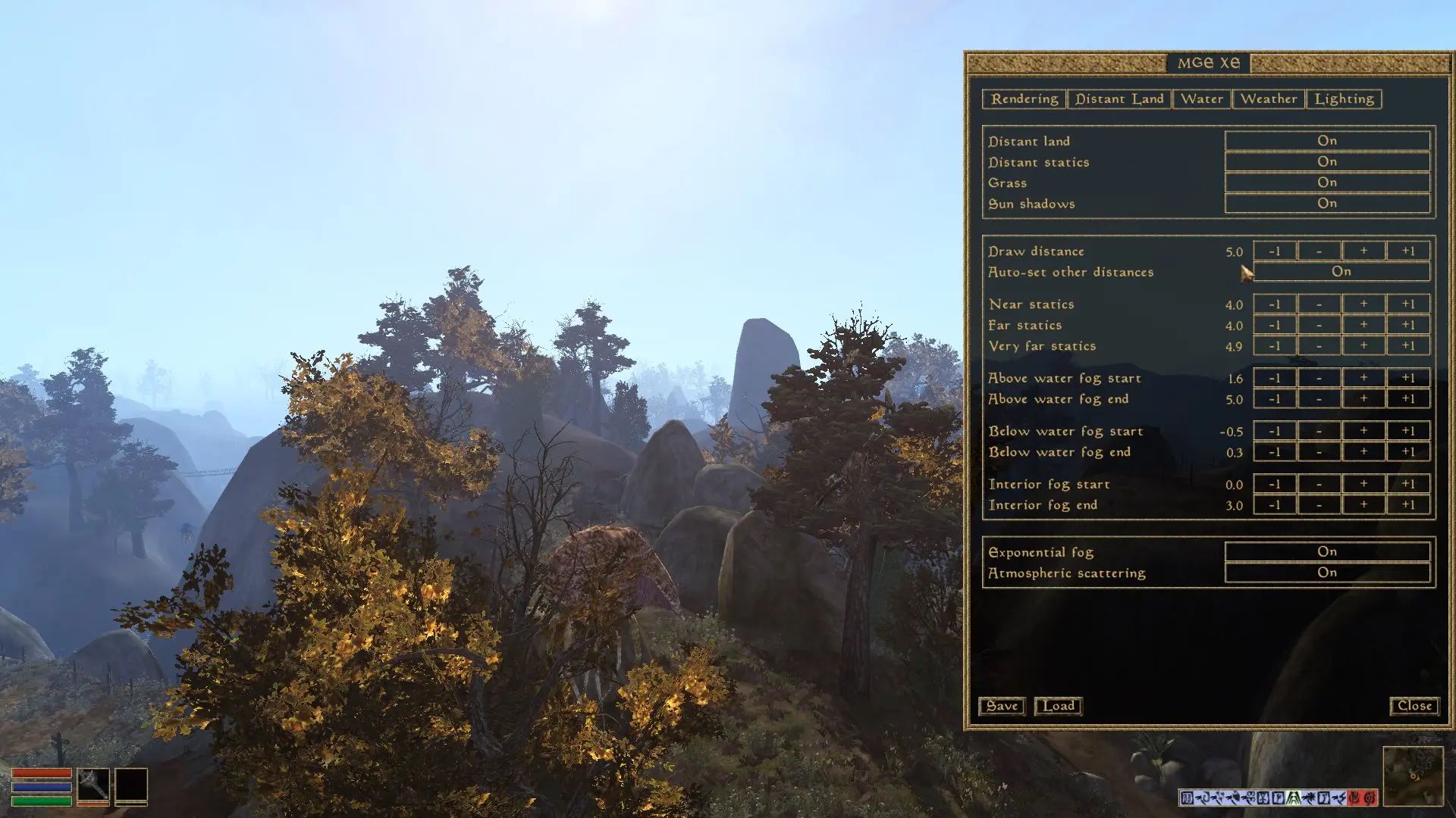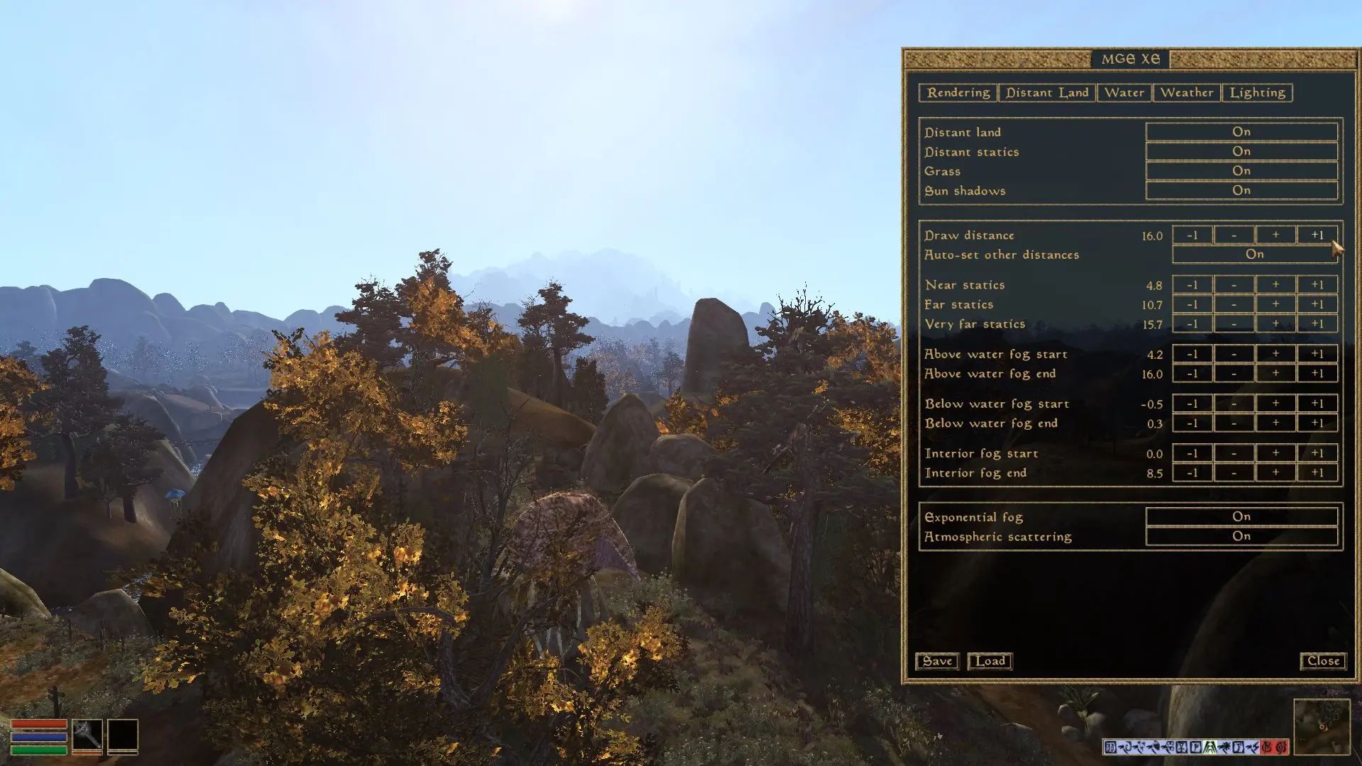 Morrowind Graphics Extender XE (MGE XE) - это дополнение к движку Morrowind для улучшения графики, увеличения дальности прорисовки, поддержки шейдеров и улучшения освещения. При установке мода через установщик будет установлен MWSE 2.1 (требуется доступ в интернет), поэтому моды, использующие Lua работают сразу. MGE XE несовместим с OpenMW. Также после установки программы в игре появится меню настройки модов (Mod config).