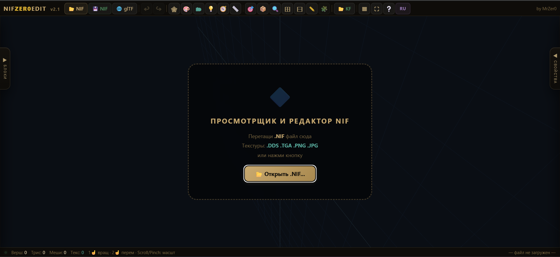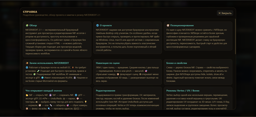 NIFZER0EDIT v2.1 - это удобный, лёгкий и современный браузерный инструмент для просмотра и редактирования NIF-ассетов без установки классического desktop-приложения. Программа подойдёт моддерам, авторам моделей и всем, кому нужен быстрый доступ к NIF/KF-файлам, базовому редактированию, просмотру текстур, UV-правкам, bone-инструментам и экспорту в glTF в кроссплатформенной среде.