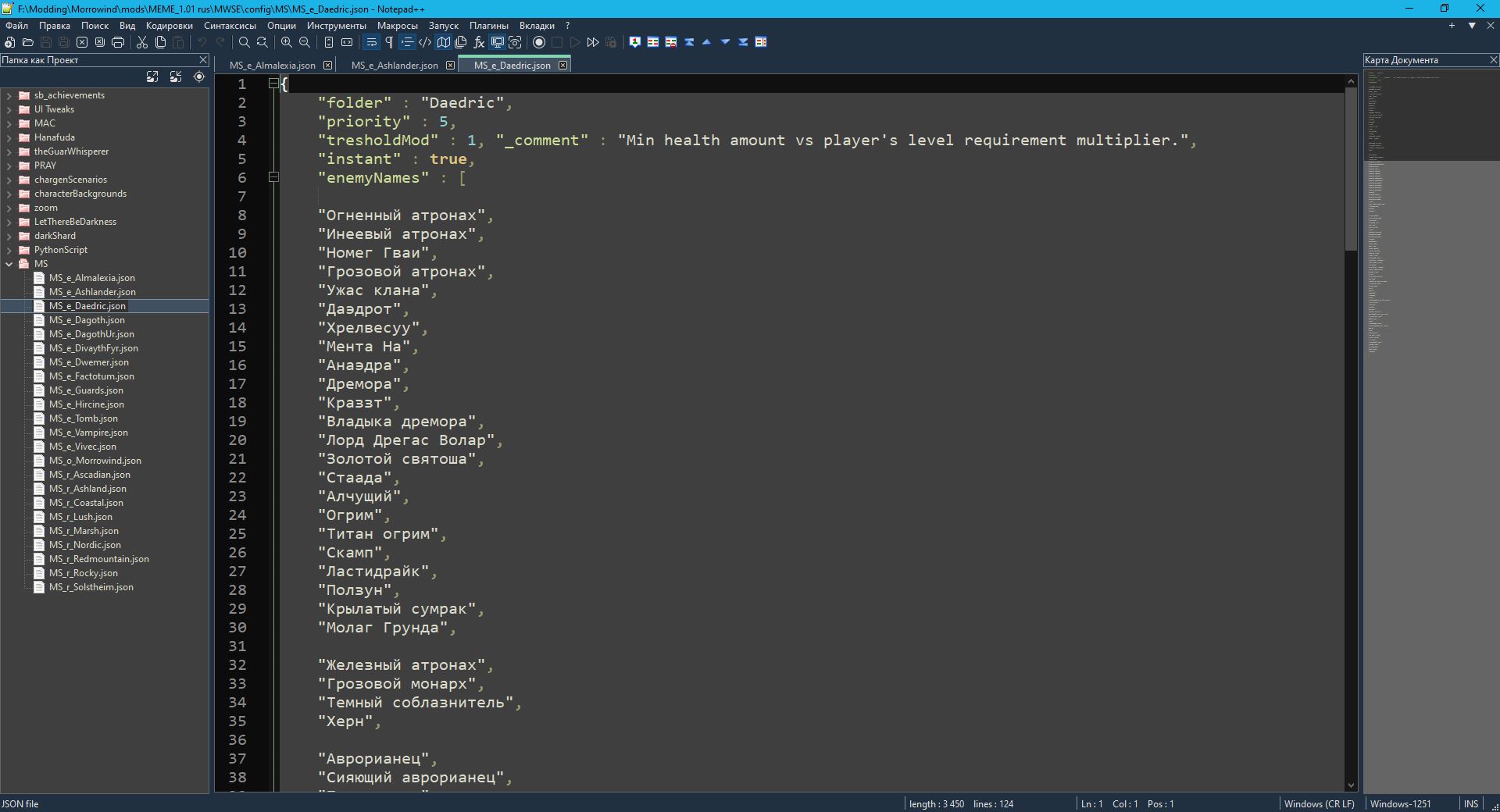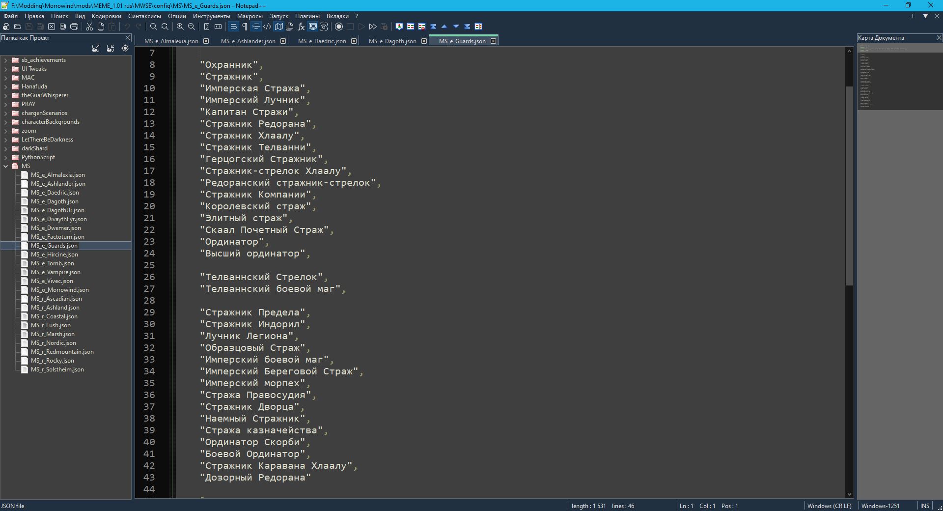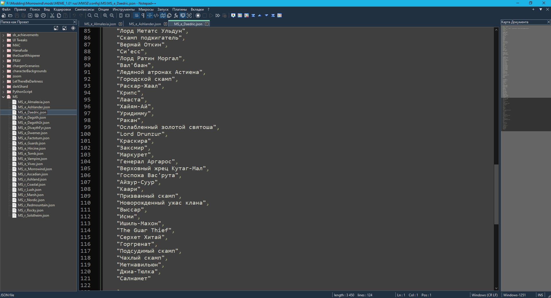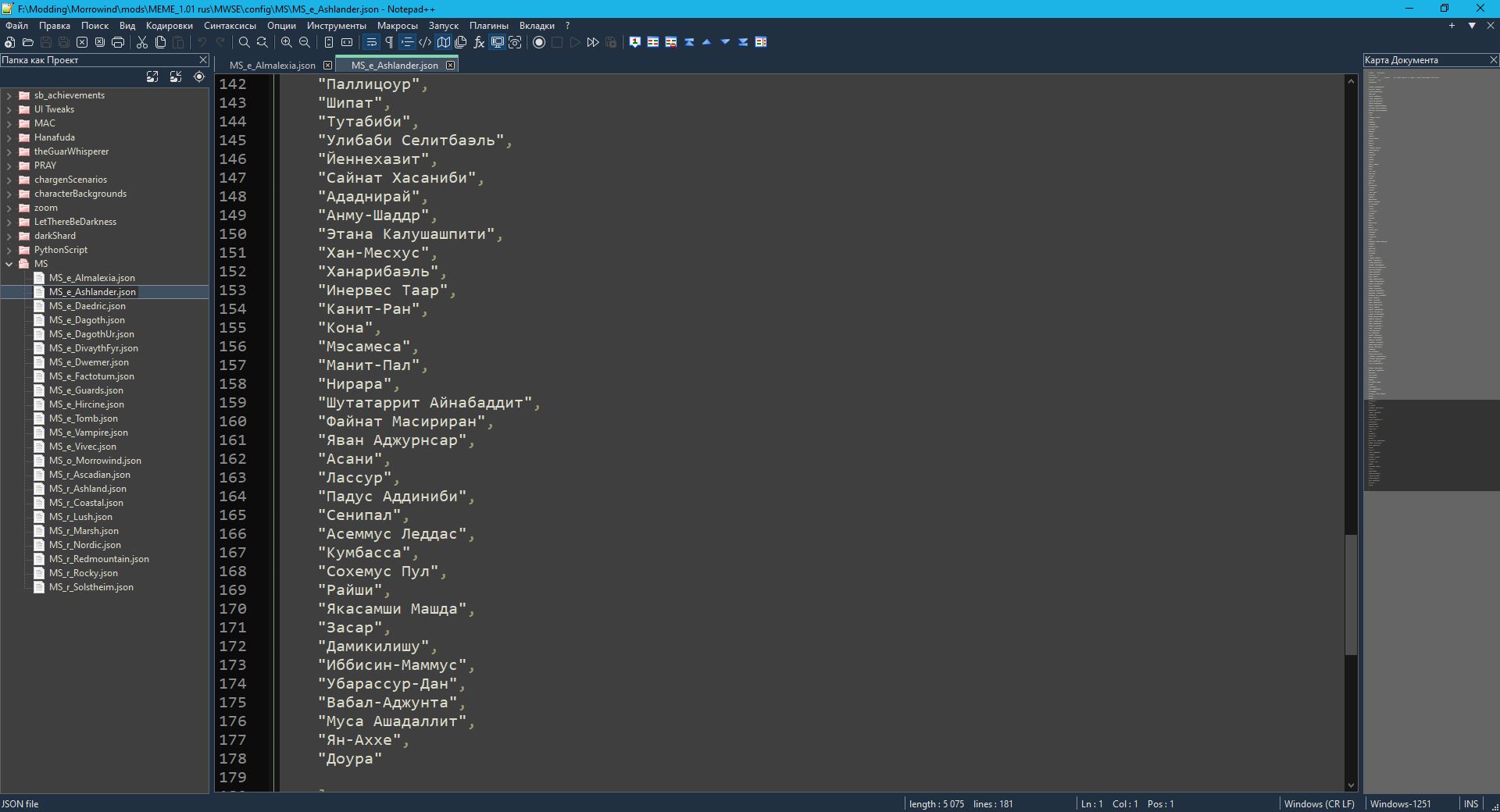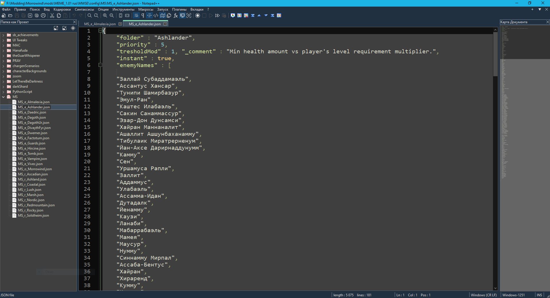 Названия регионов и имена NPC и существ в файлах конфигурации изменены на русские в соответствии с переводом 1с\акелла. Имена NPC и существ из глобального мода Tamriel Rebuilt изменены в соответствии с переводом "Русский Тамриэль" https://t.me/tamrielrus https://tesall.club/files/modi-dlya-morrowind/globalnie-plagini/13770-tamriel-rebuilt-ru-23-10-beta