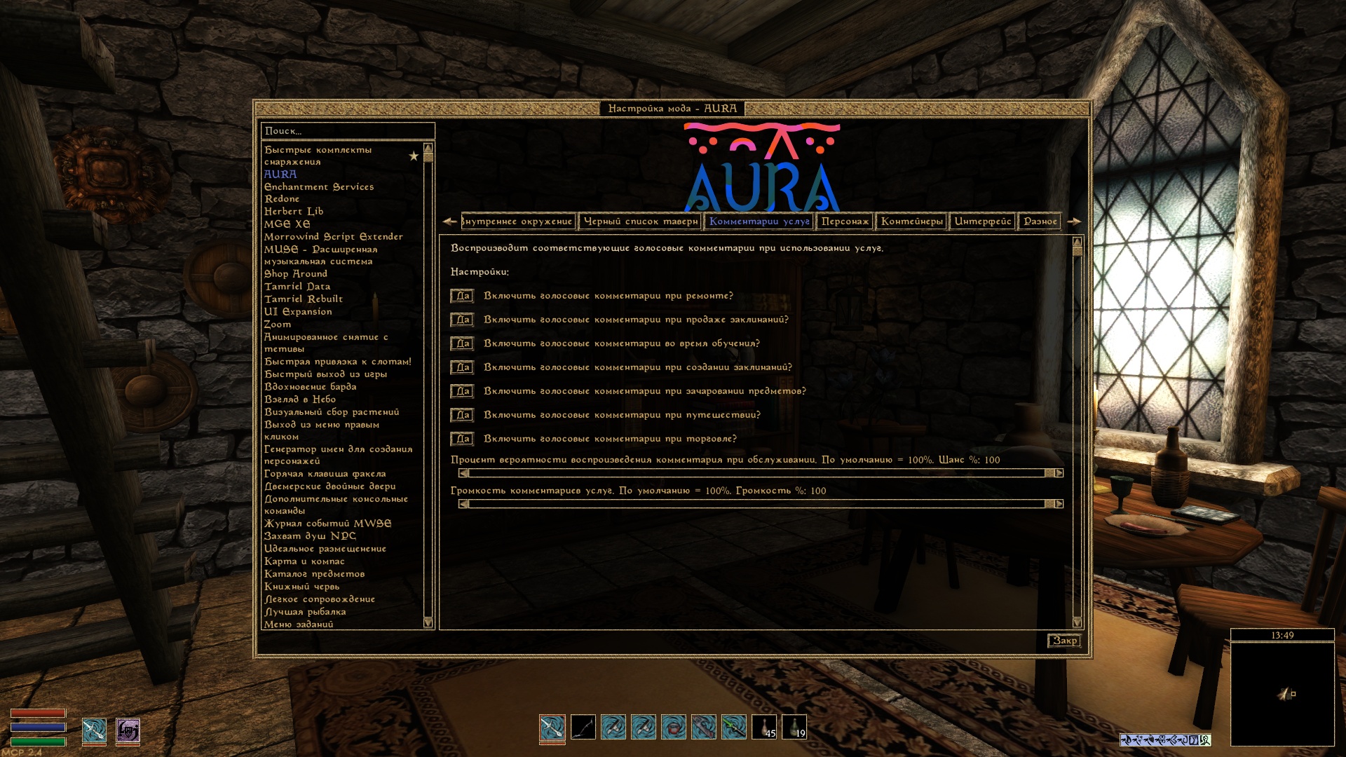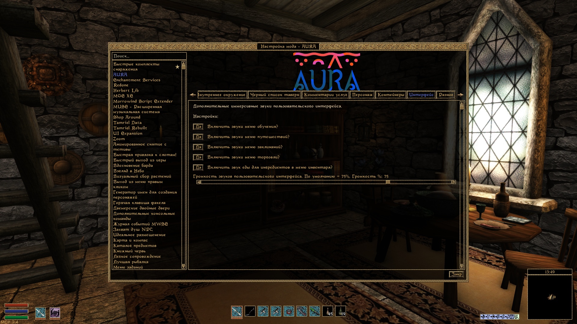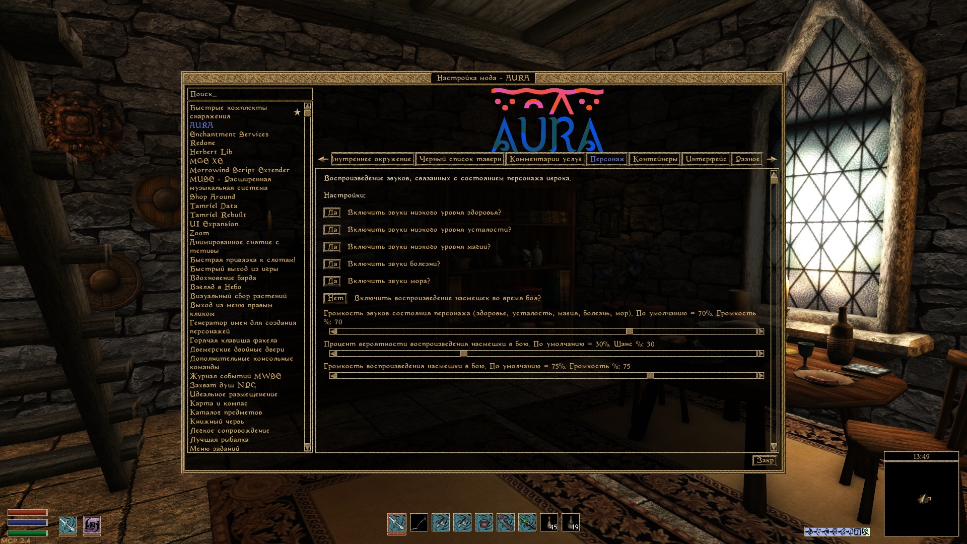 Настройка через меню настройки модов.