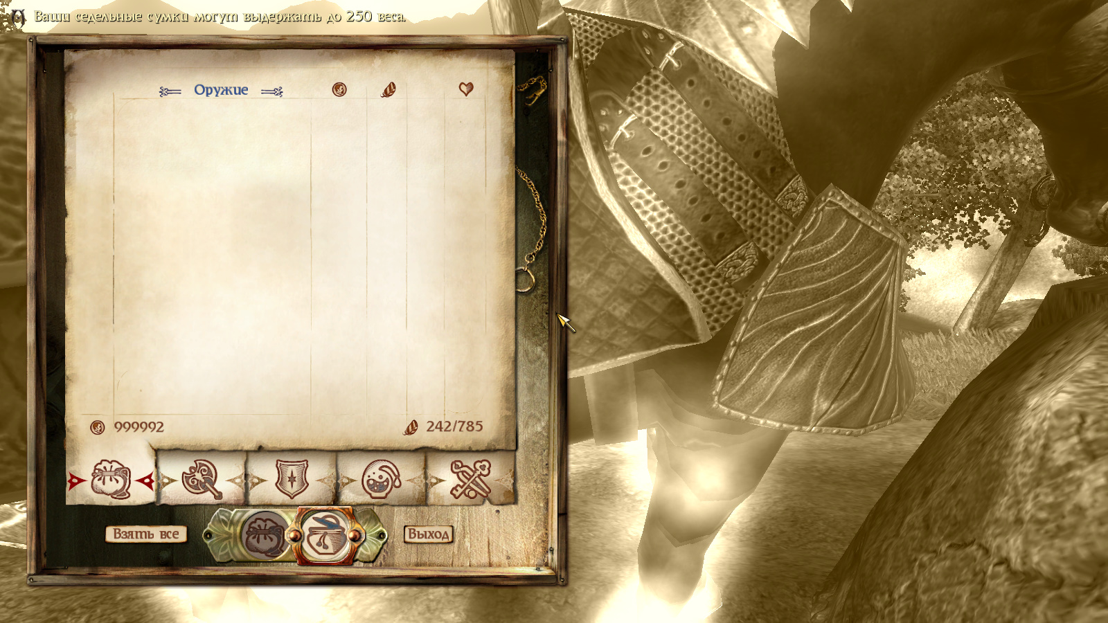 Вместимость седельных сумок ограничена в зависимости от атрибута Силы вашей лошади. Чтобы получить доступ к седельным сумкам, нужно владеть лошадью, и вы должны будете сесть на нее и слезть, если это не последняя лошадь, на которой вы скакали - делать это нужно всего раз, пока не смените скакуна. В сумки к украденной лошади, или той, которая вам не принадлежит, получить доступ к сумкам нельзя.