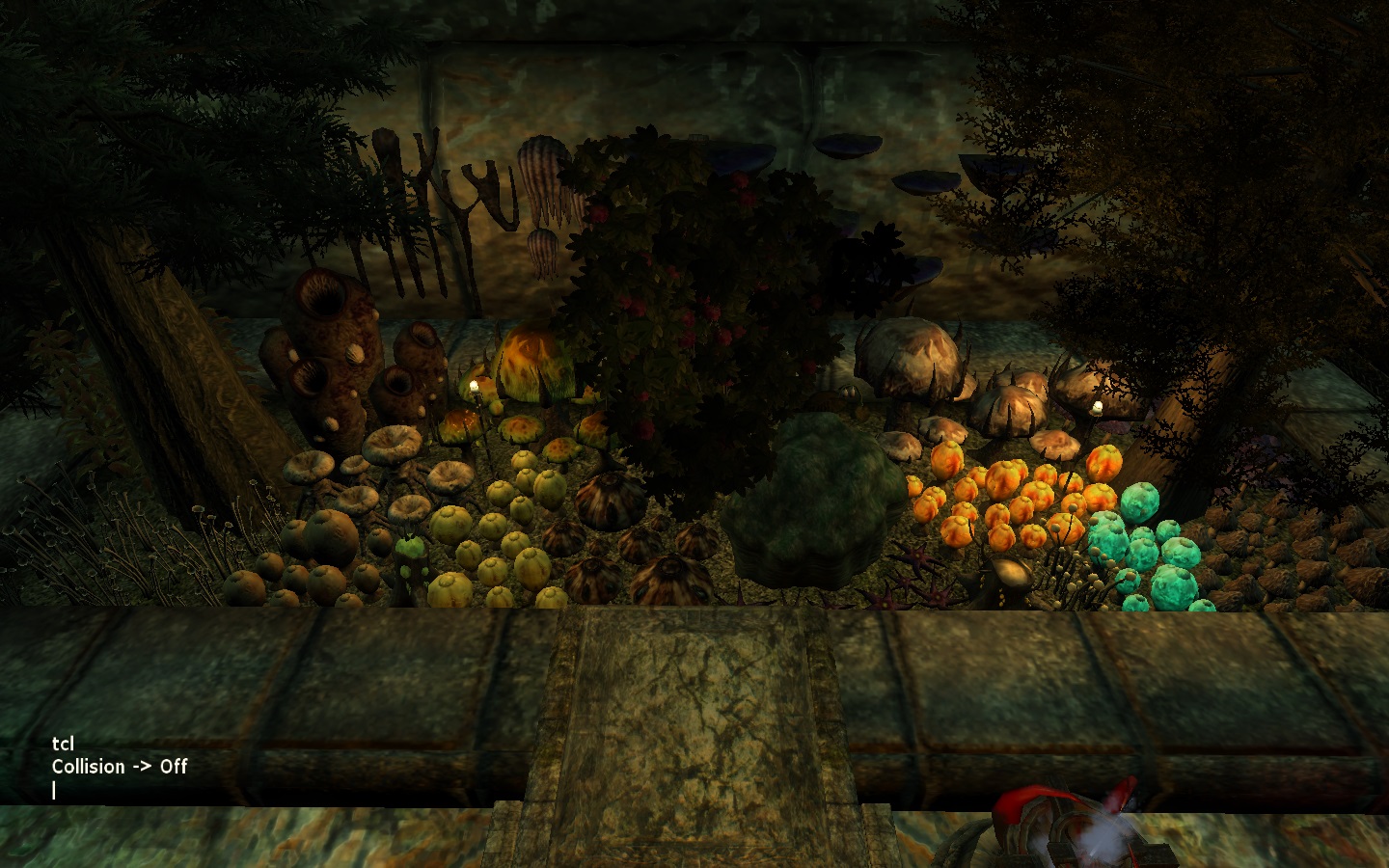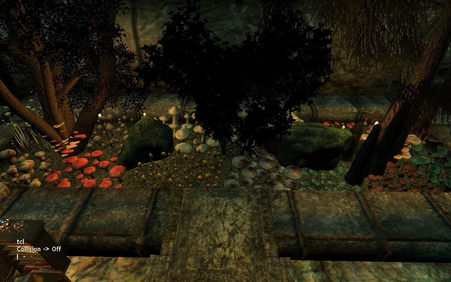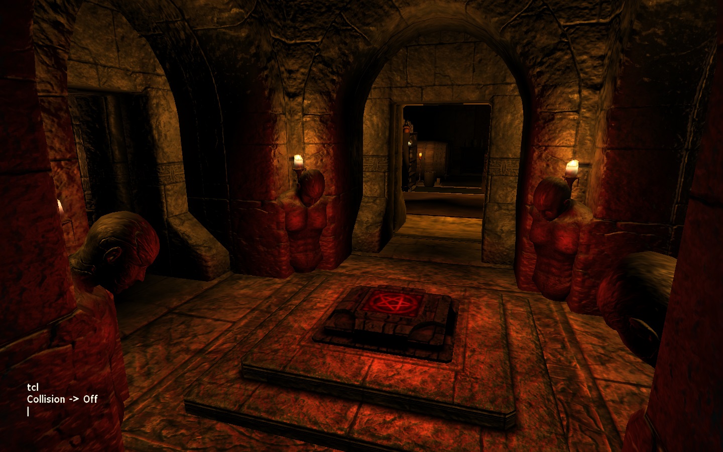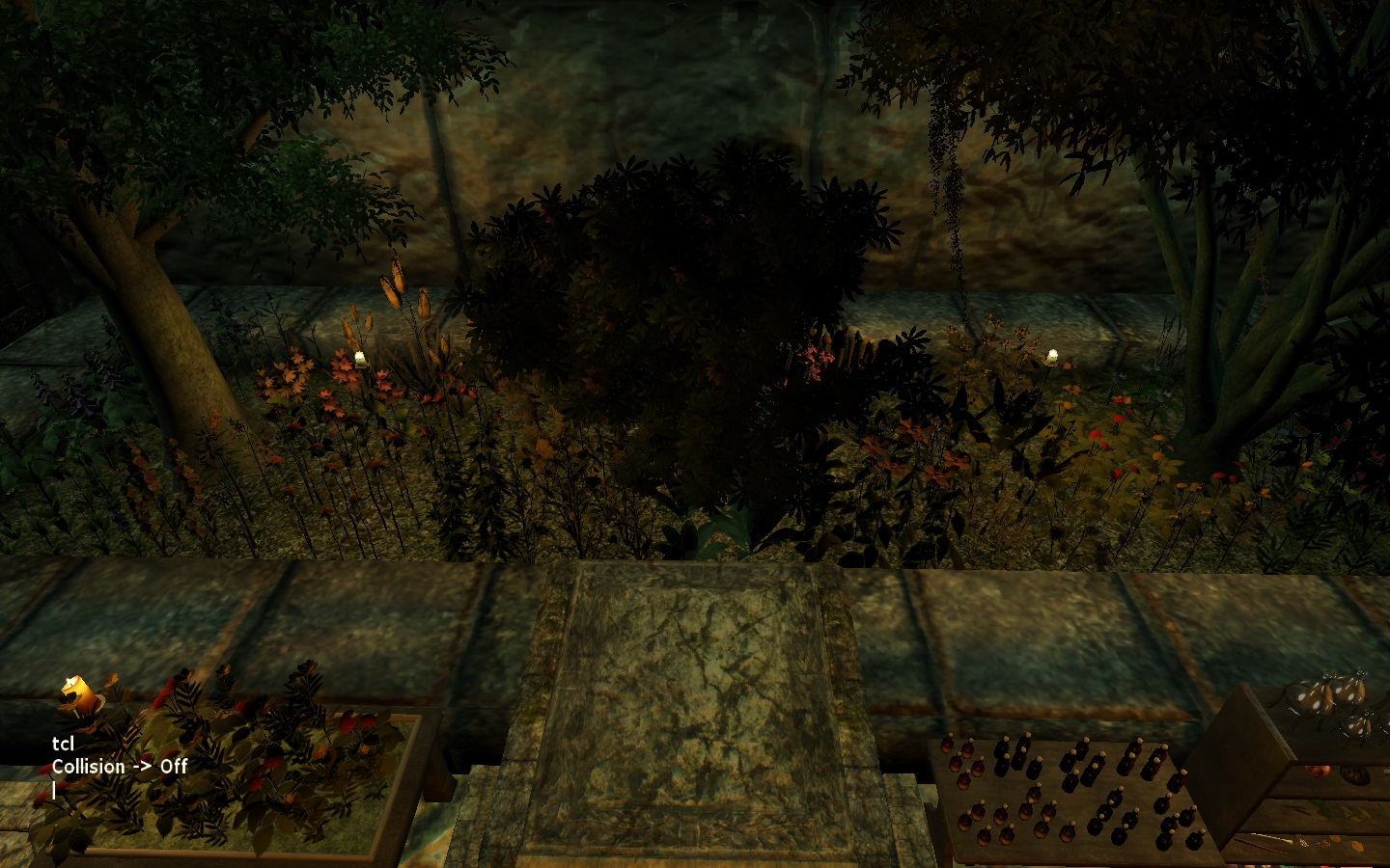 В помещениях с "каменной" текстурой пола (лаборатория, главный зал, святилище) персонаж может иногда проходить "сквозь" ступени на лестницах, расположенных в этих локациях. Это не проблема, достаточно сделать прыжок, чтобы вылезти из текстуры ступеней. Увы, я не могу решить эту проблему, она досталась в наследство от оригинального плагина. Его автор сделал такую вот слегка багнутую текстуру своего пола.