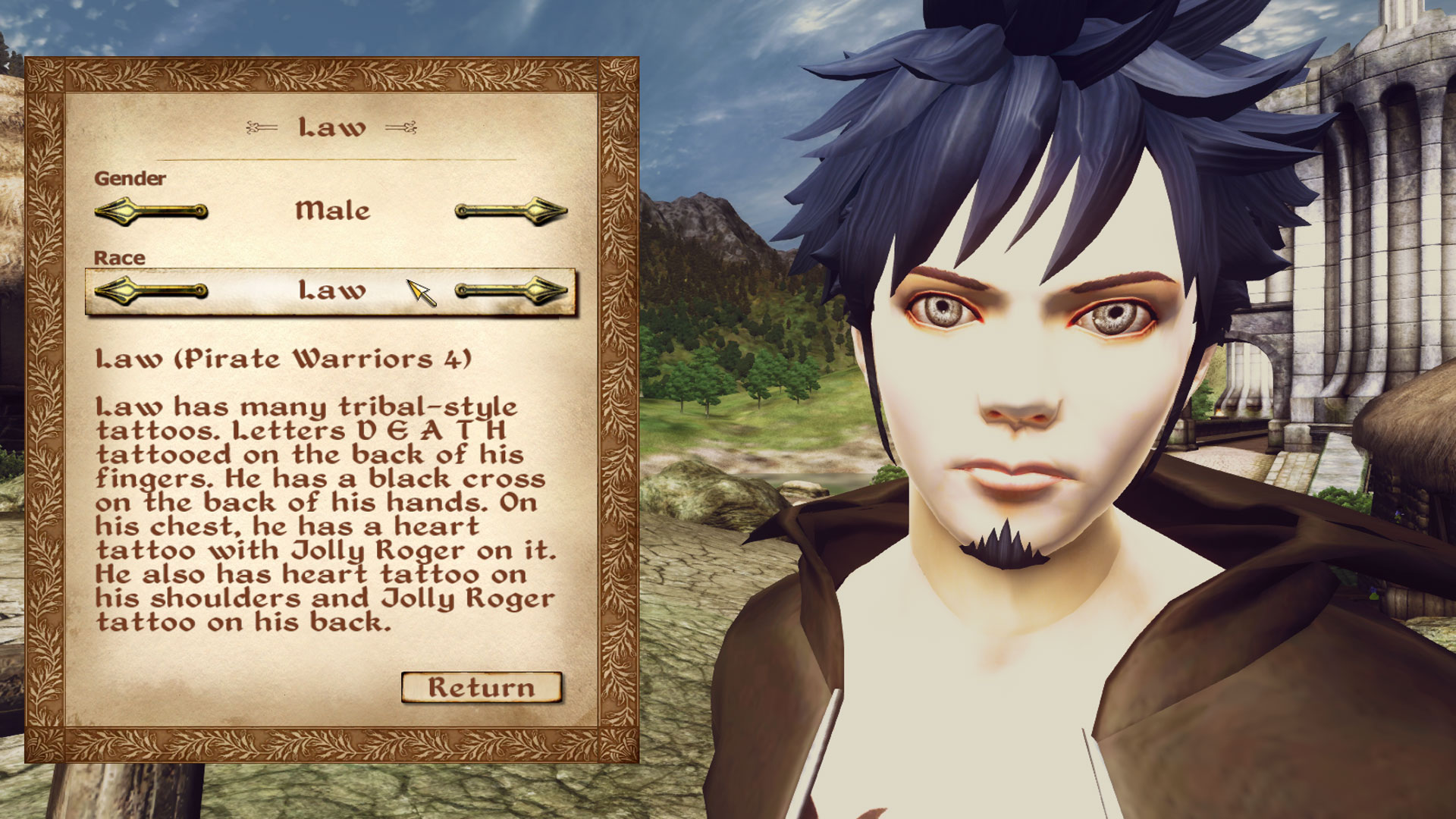 Added Nico Robin Dressrosa clothing from Pirate Warriors 3 game and Law Dressrosa clothing and weapon from Pirate Warriors 4 game.