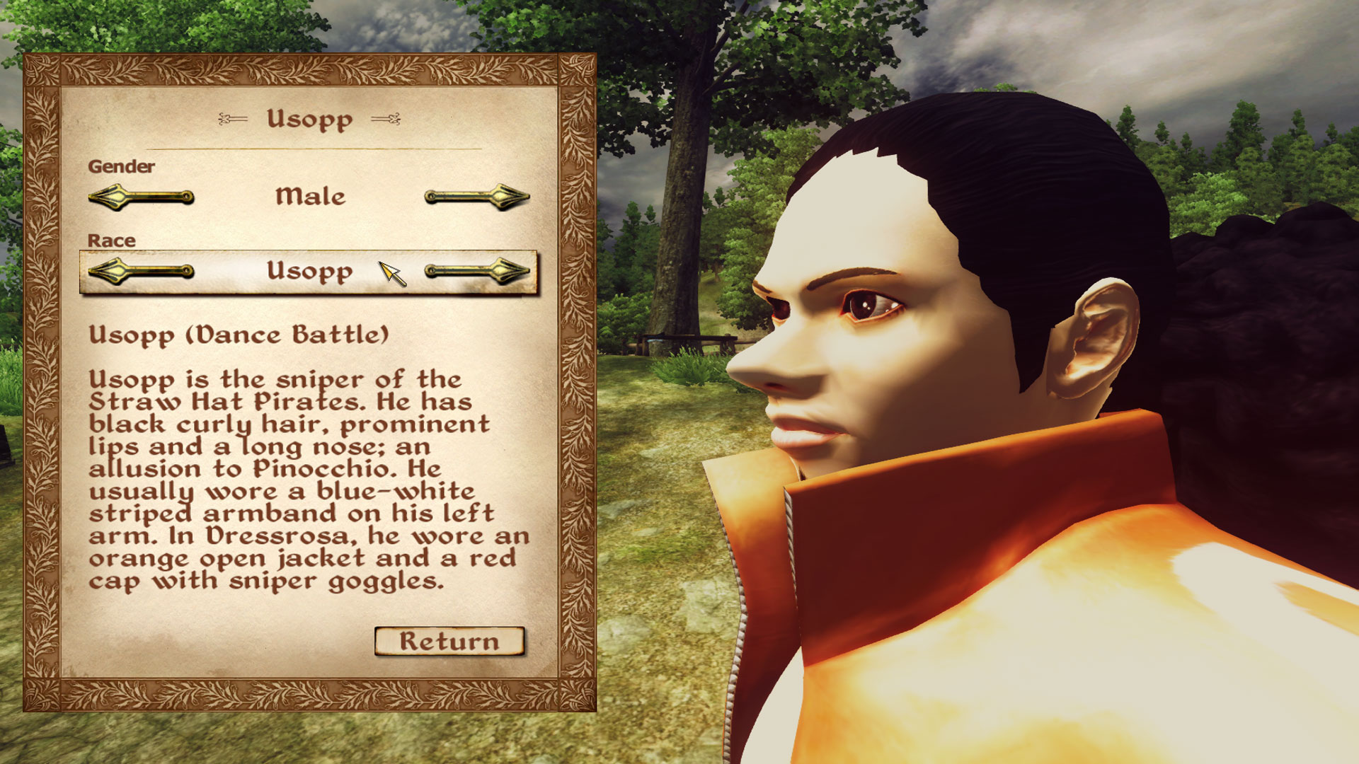 Added Usopp Dressrosa clothing from One Piece Dance Battle game and his default weapon from Pirate Warriors 3 game.