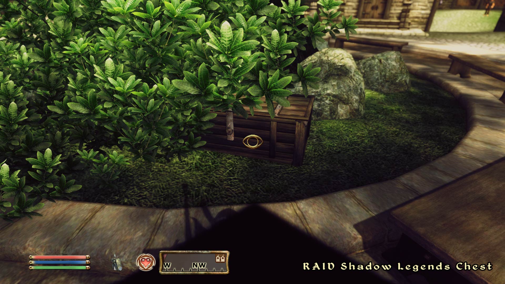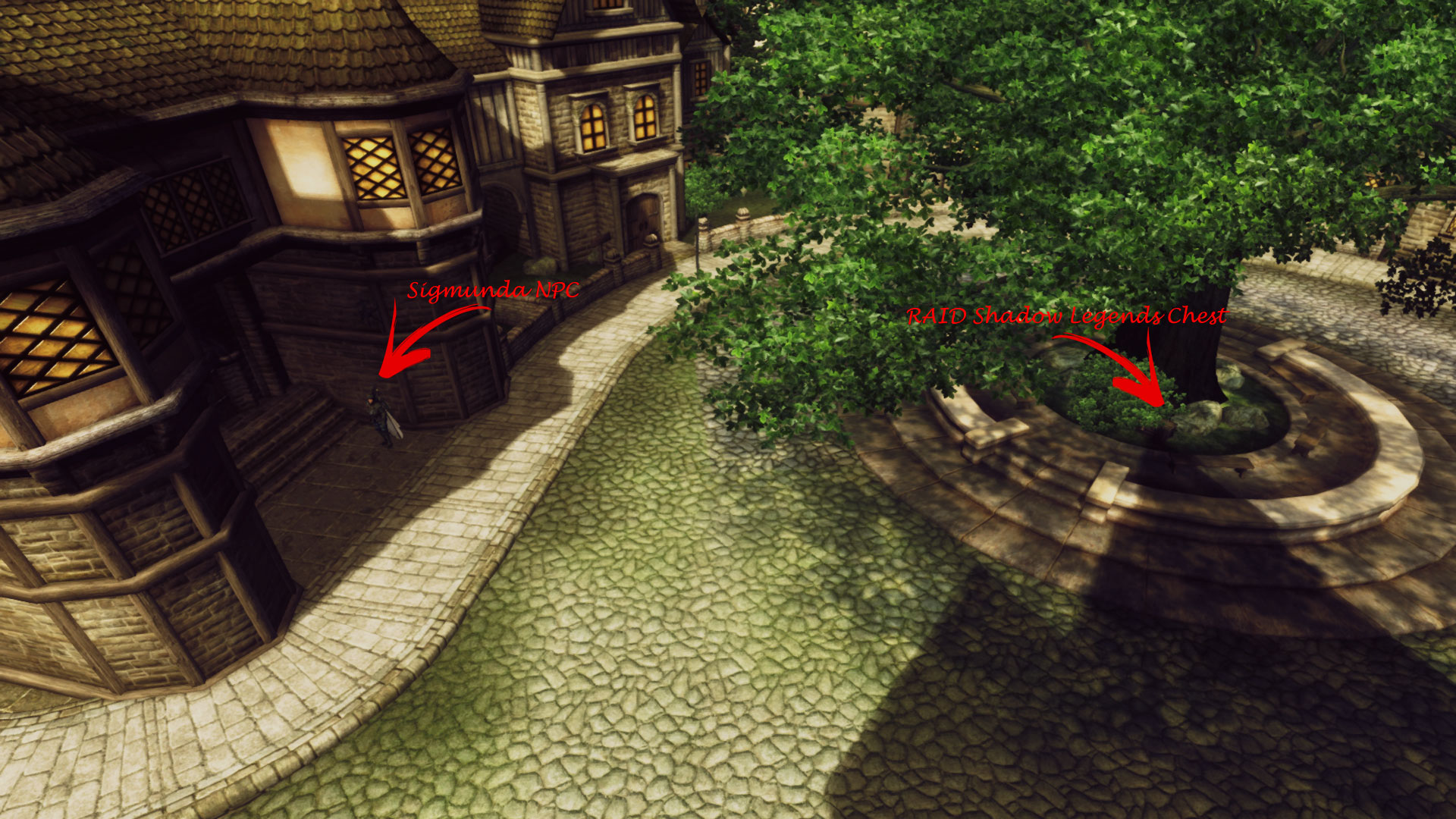 There is RAID Shadow Legends chest in the middle of the roundabout in front of the house.