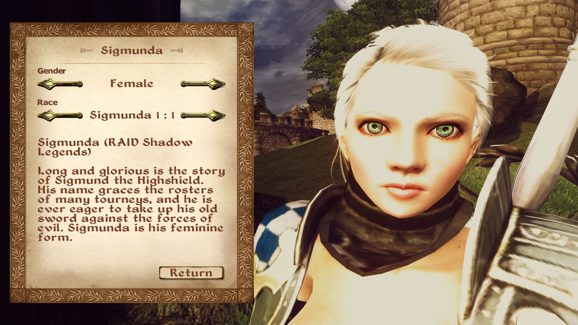 Added weapon, shield & female version of Sigmund the Highshield's armor from the game RAID Shadow Legends, and separate them into parts to customize your character's appearance.