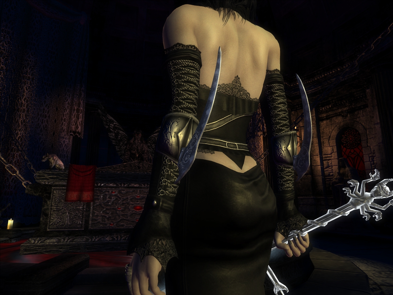 Плагин добавляет в игру темное элегантное платье, выполненное в готическом стиле, и аксессуары к нему. Вещи находятся в тестовом зале, в айлейдском сундуке. Чтобы попасть туда - наберите в консоли "coc Testinghall" (Без кавычек).