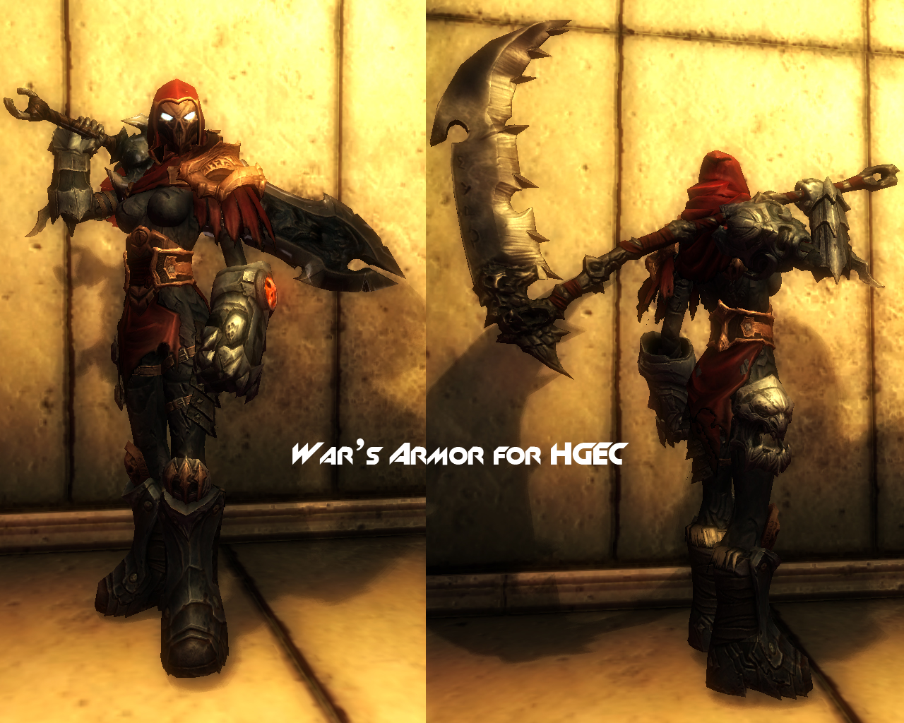 Плагин добавляет в Обливион снаряжение (броня и оружие) ангела Уриэль и всадника Войны из игры Darksiders. Броня войны подходит обоим полам. Лежат все вещи можно в руинах Варделя, находящийся рядом с Вейе.
