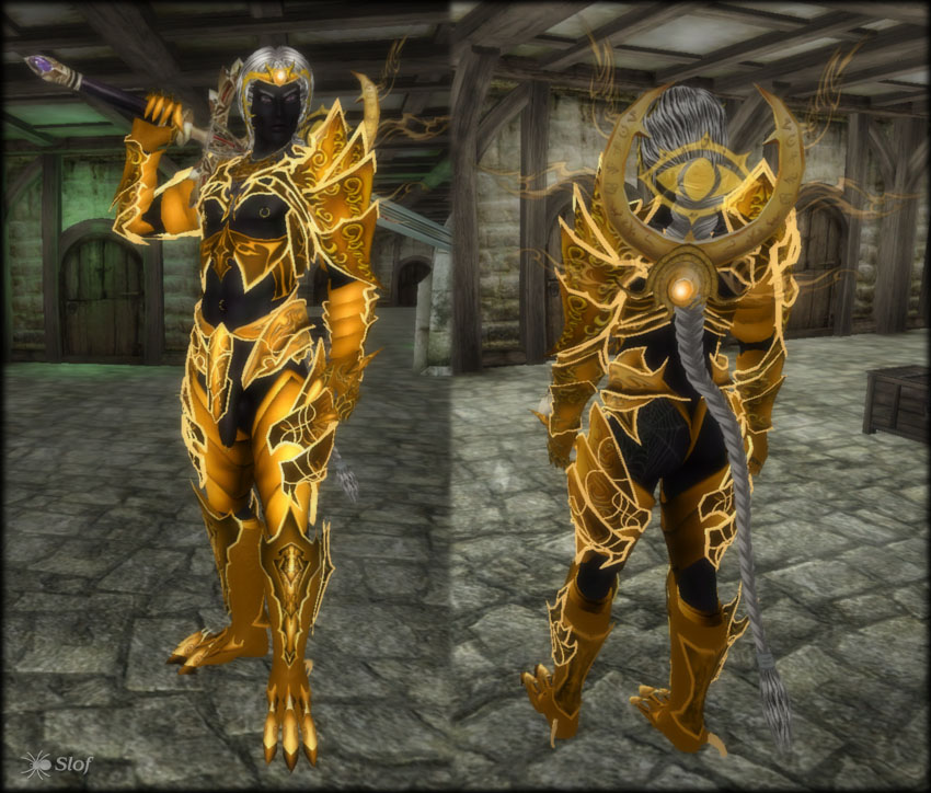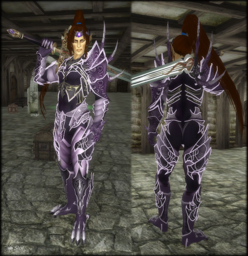 Alien Slof в основном занимается нестандартными видами одежды и брони для мужских персонажей. Так что тема обнажённых частей тела - обычное дело в работах данного (Готические Магазины и нестандартные реплейсеры мужской брони - явное тому подтверждение).