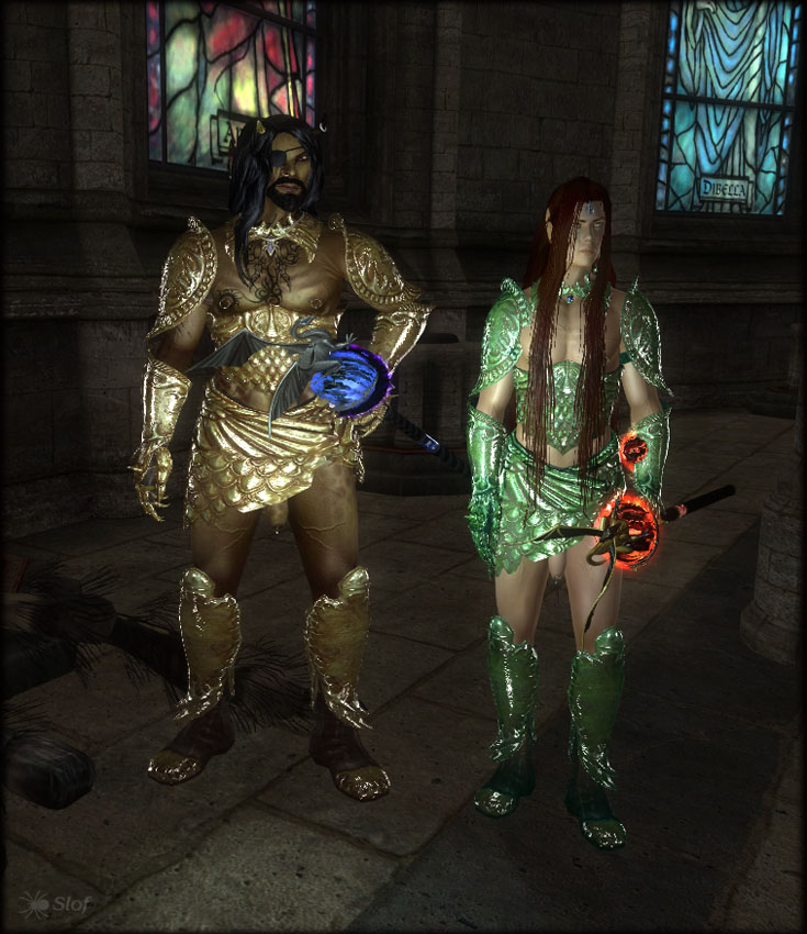 Комплекты стеклянной прозрачной брони святого, разных цветов. Можно найти в подвале часовни Бравила и Брумы, а так же отбить у бандитов в форте Урасек. Добавлена женская версия.