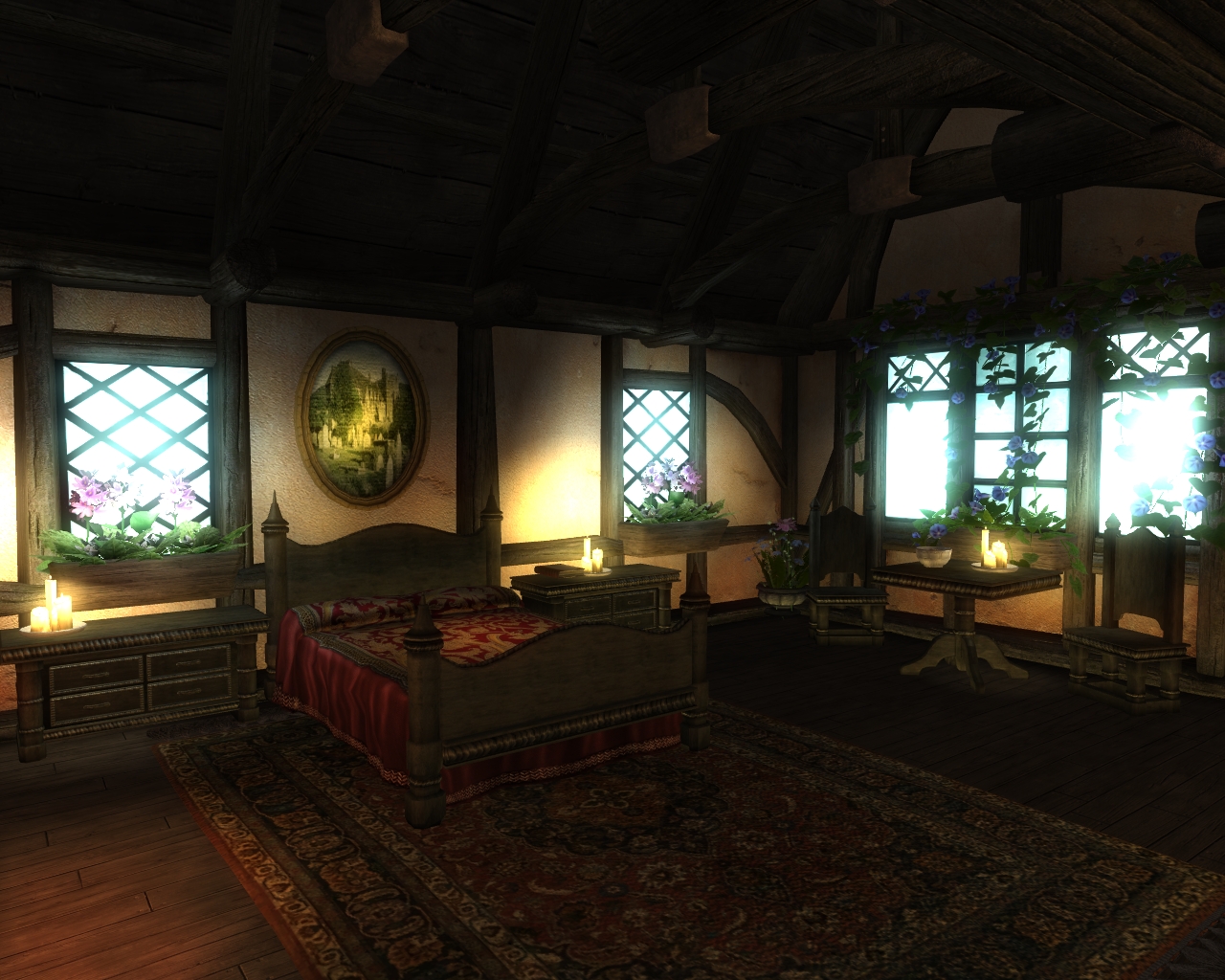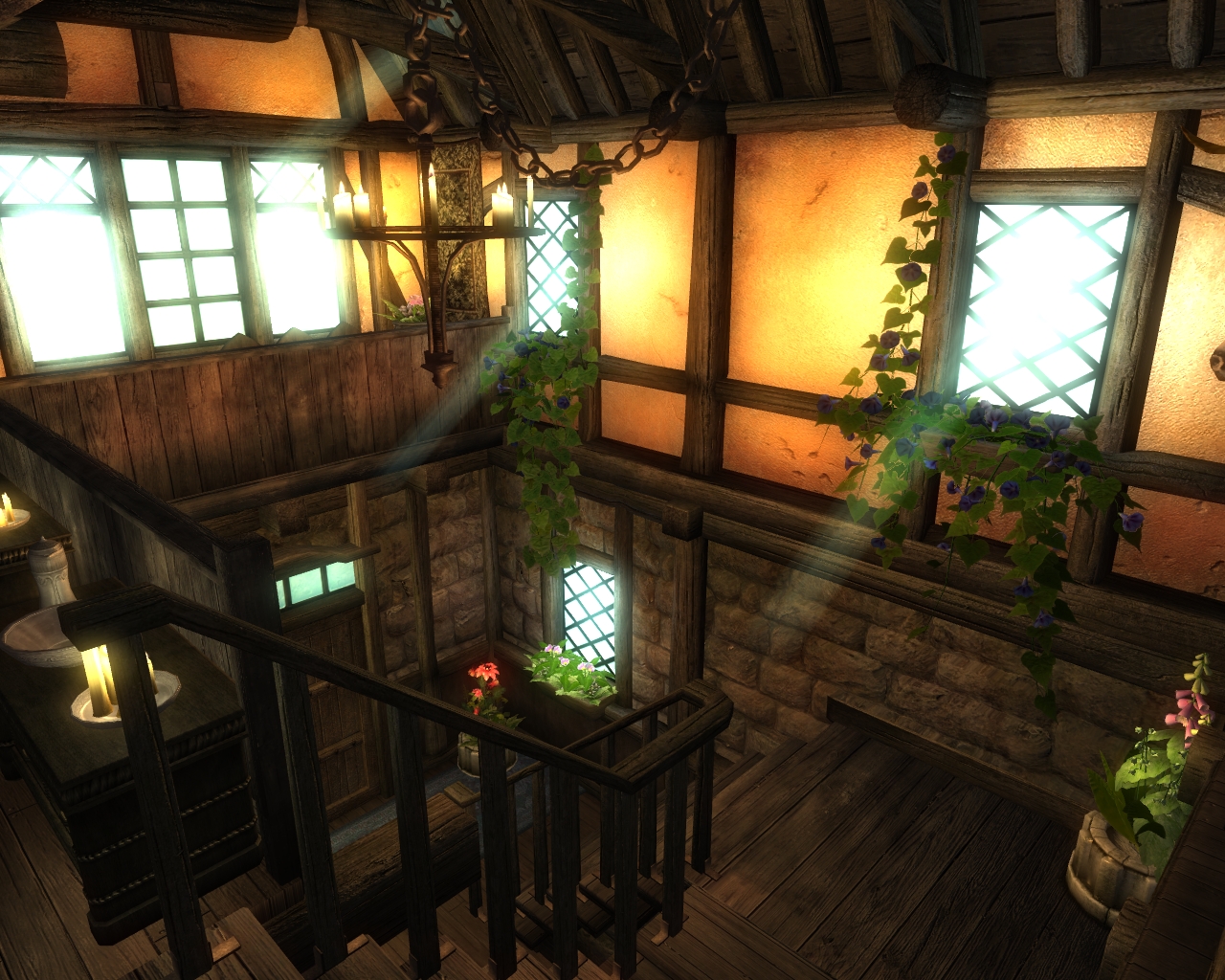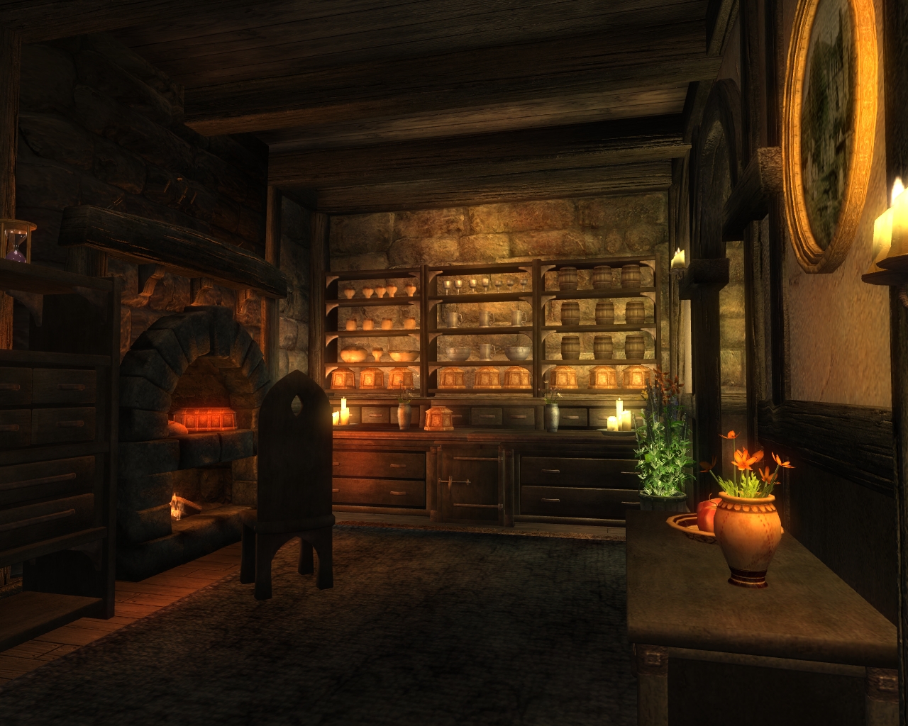 Что касается интересных особенностей , то в доме есть печь, в которой можно готовить 3 вида хлеба, а в подвале бочонки с пивом и вином, пивные кружки и кувшины для вина стоят на полке неподалеку. Так же в доме есть алхимический стол и алтарь девяти. Камин, в котором вы можете зажигать и тушить огонь. Динамическая система освещения, зависящая от времени суток.