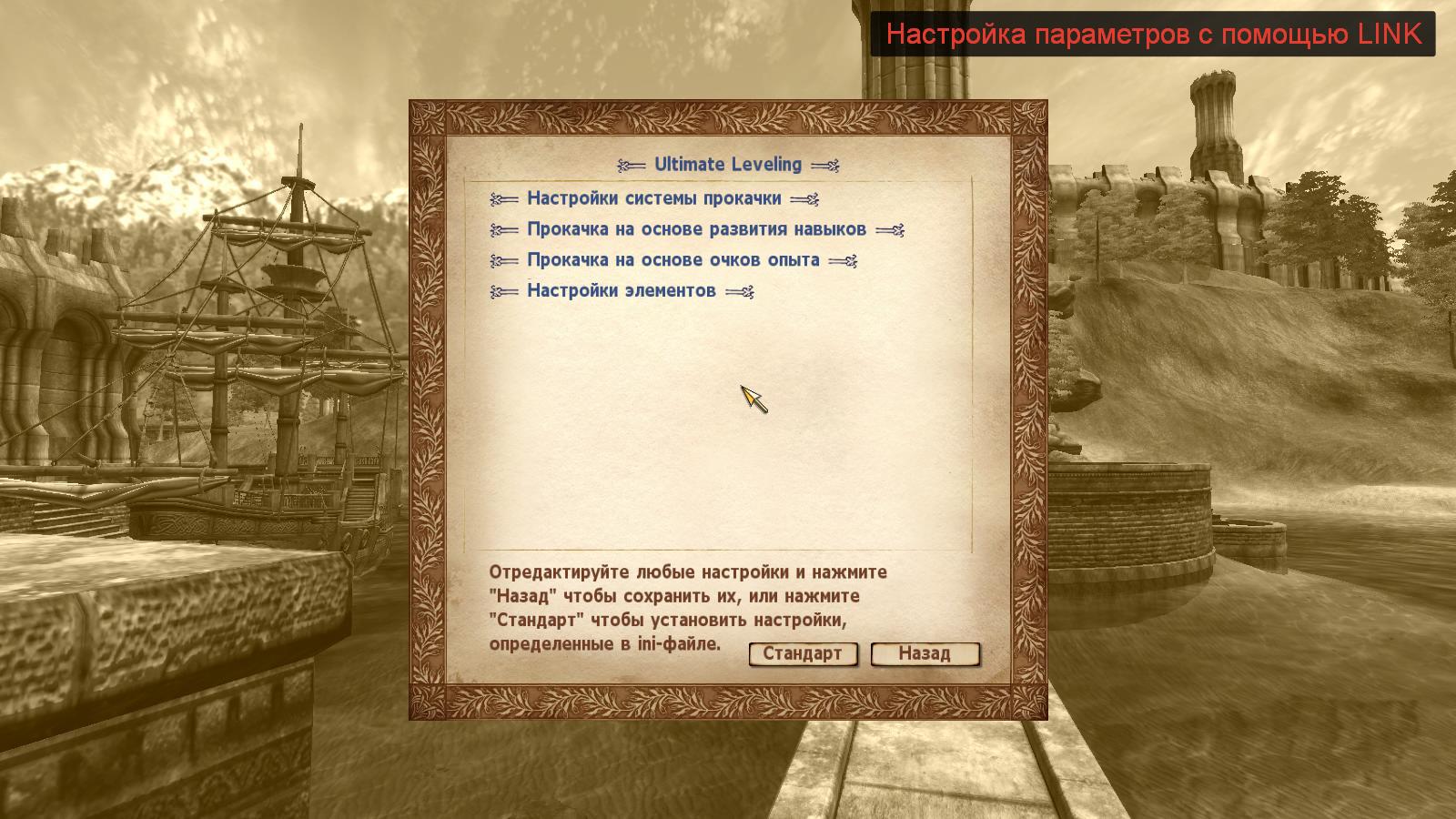 Настройка: По умолчанию, персонаж игрока, использует систему повышения уровней, основанную на опыте, с настройками, определенными в основном INI-файле. (Ultimate Leveling.ini). Отредактируйте этот файл, чтобы выбрать другую систему уровней и/или настройте ее в соответствии с вашими предпочтениями.