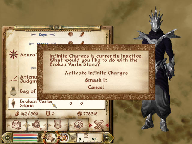 Все зачарованные предметы будут перезаряжаться (через камень Варла) каждый раз, когда ГГ достаёт оружие. Эту функцию можно включить, отключить или отключить навсегда (для удаления) с помощью предмета (Поврежденный камень Варла) в игре. Предмет автоматически добавляется в инвентарь после установки этого мода и после того, как ГГ покинет подземелье создания персонажа.