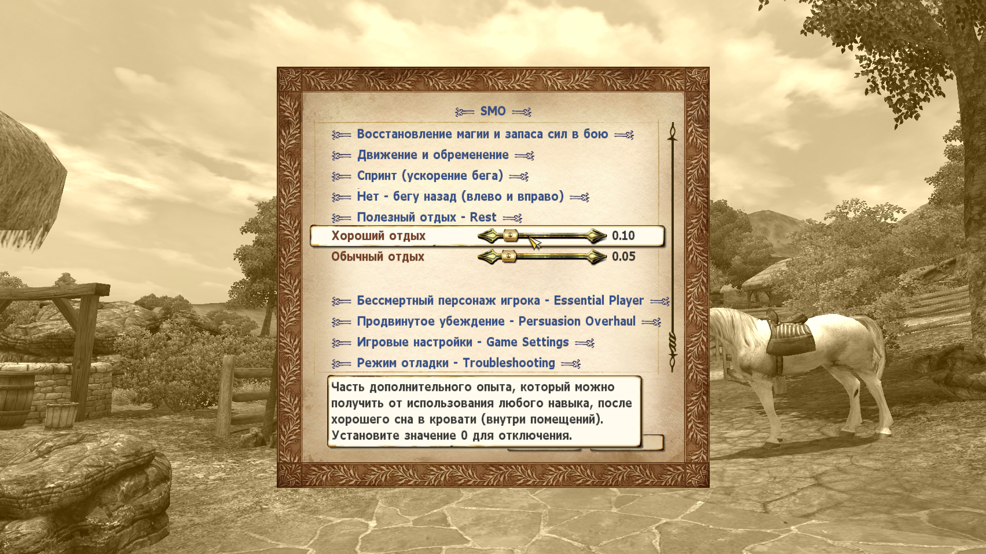 - Небольшой конфликт с бонусом отдыха. Отключите настройку бонуса от отдыха в ini-файле одного из модов, в "Ultimate leveling" или в "Supreme overhaul".