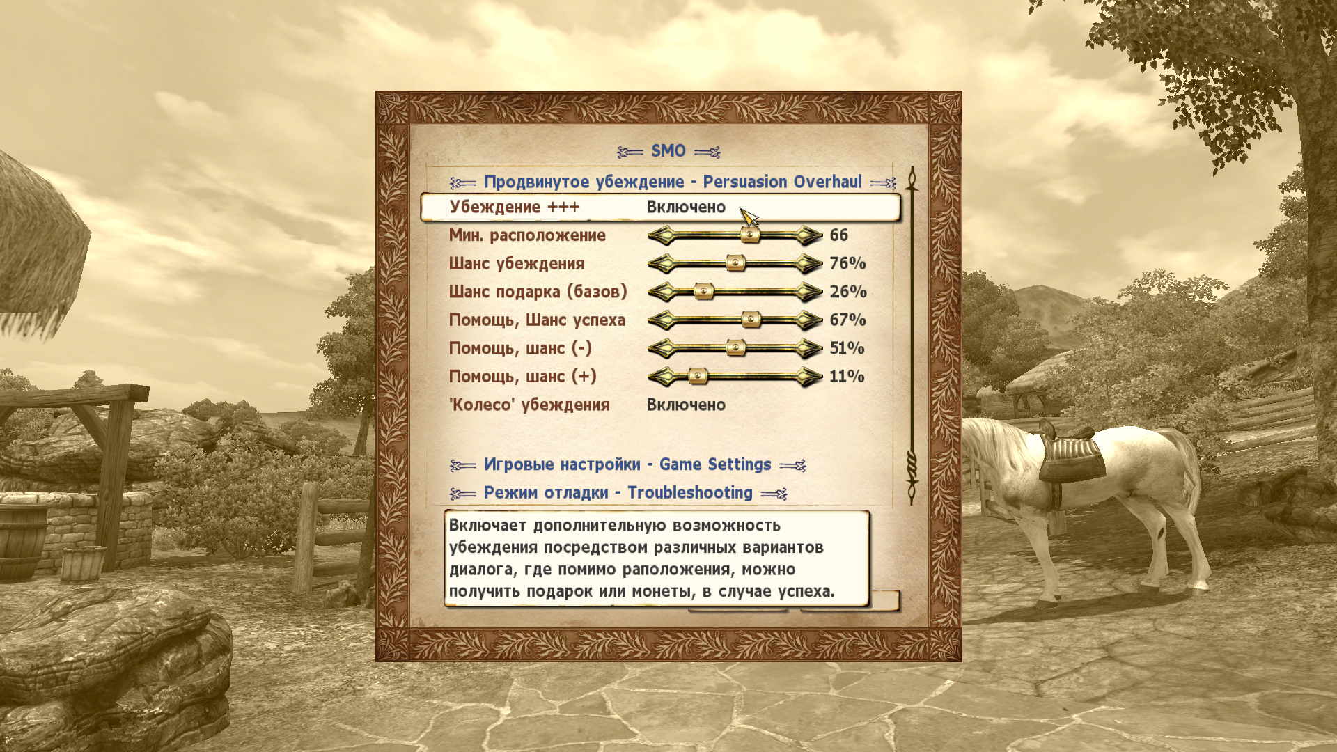 Если вы хотите усложнить игру, вы можете полностью отключить мини-игру "колесо убеждения", требующее от вас успехов в диалоговой системе убеждения или тренеровки для повышения уровня Красноречия.
