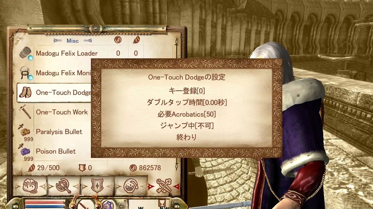 Мод добавляющий в обливион механику уклонений. После установки даного мода в ваш инвентарь попадет предмет, с помощью которого можно настроить мод - с помощью которой клавиши нужно активировать уклонение, какой минимальный уровень навыка прокачки акробатика нужен для его использования и так далее.