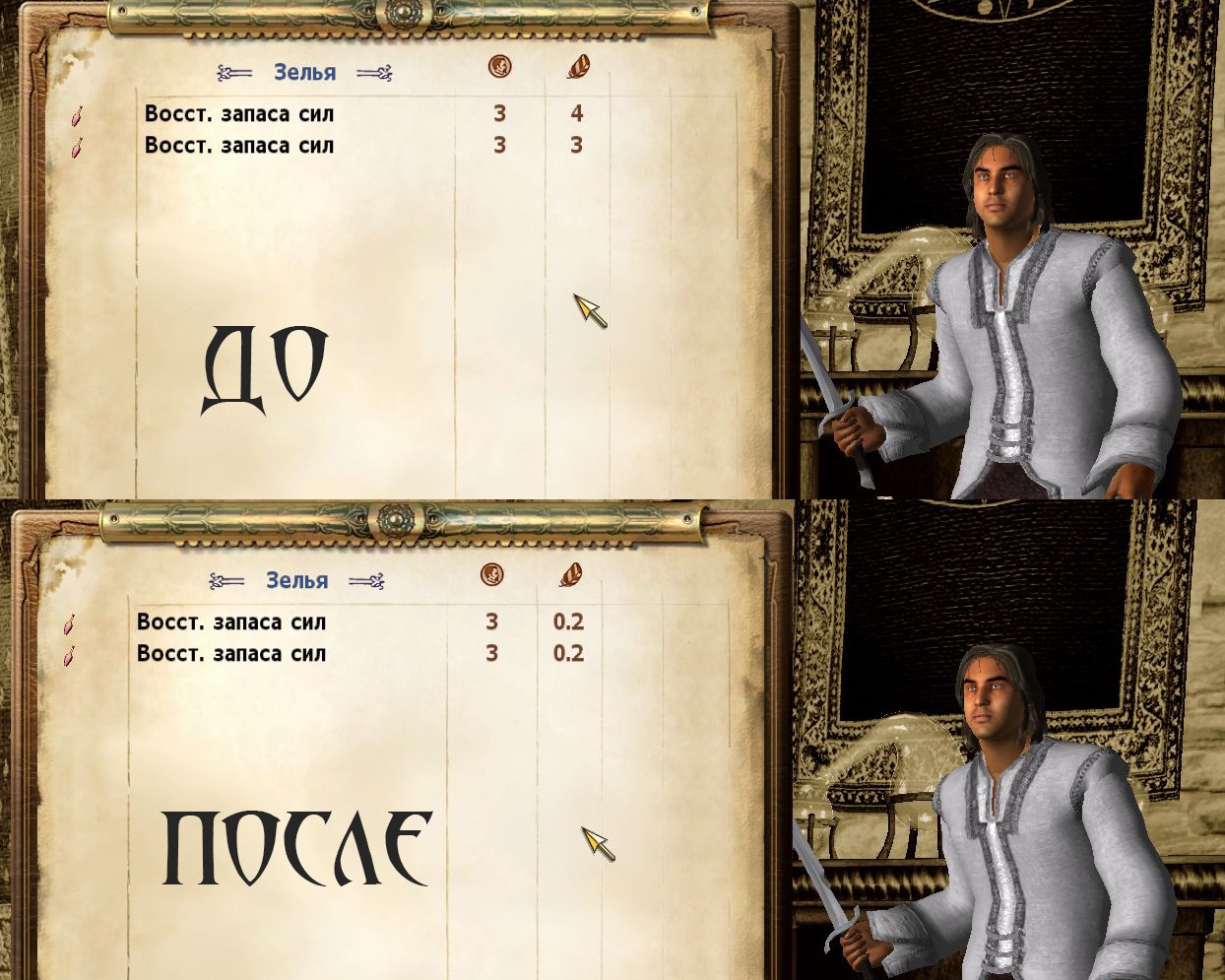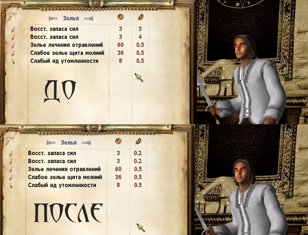 Вам не кажется странным, что вес зелий зависит от веса первого созданного зелья того же типа? Мне кажется. Поэтому я создал мод, автоматически делающий вес зелий одинаковым.