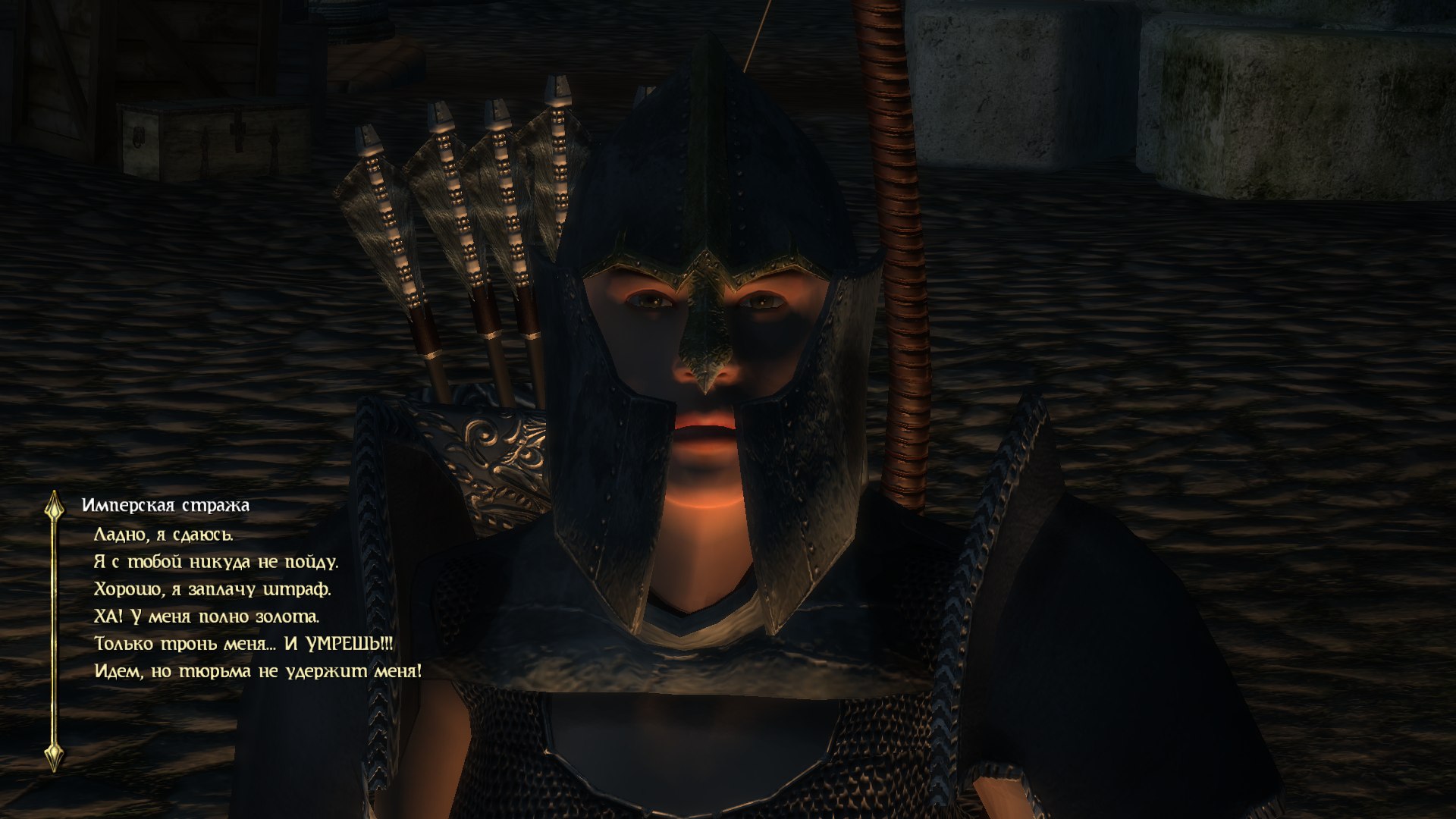 Стражи могут допрашивать вас по поводу преступлений. Вы можете убедить их разными путями не арестовывать вас, запугивая, извиняясь или бравируя своими титулами в разных гильдиях. Вы так же можете попробовать обмануть стражника. Чемпиона Сиродила могут вообще не штрафовать, безотносительно заявленной награды за голову. Остальные могут пробовать отделаться штрафом за серьезные преступления.